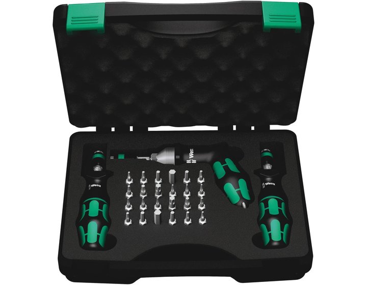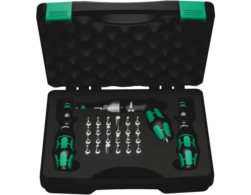 Набор динамометрических отверток Wera. Две динамометрические отвёртки с высокоточной установой значений момента силы. Динамометрическая отвёртка с ручкой Kraftform пистолетной формы для очень высокой передачи моментов силы, многокомпонентное исполнение для высокой скорости работы и особенно эргономичного завинчивания. Простая установка необходимого значения без специального инструмента. Хорошо читаемая шкала. Быстрозажимной патрон Rapidaptor для моментальной смены битов. Без ограничения момента силы при отвинчивании трудноподдающихся винтов. Многокомпонентная ручка Kraftform с твёрдыми и мягкими зонами для высокой скорости работы и для щадящего контакта с ладонью. Набор битов в высококачественном и прочном футляре из пластика.