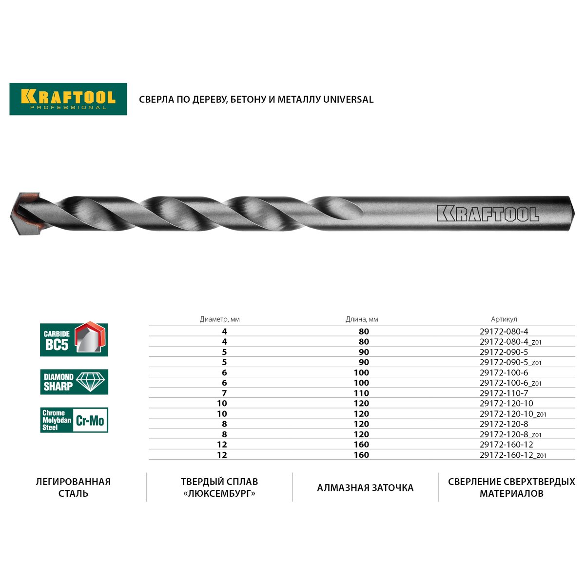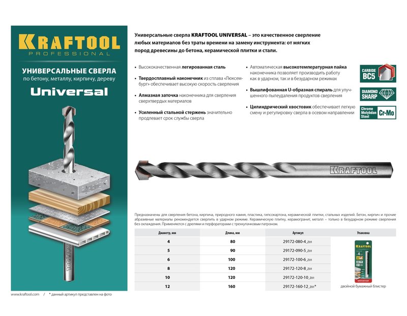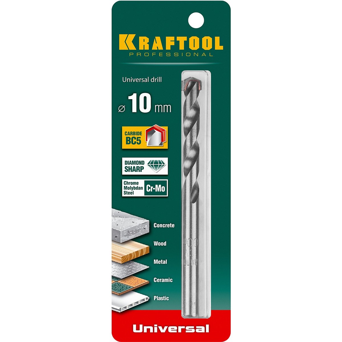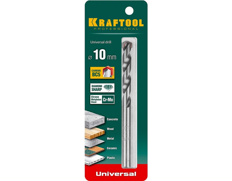 Сверло универсальное 10 x 120 мм, KRAFTOOL29172-120-10_z01, предназначено для сверления различных материалов: бетона, металла, кирпича, камня, керамики. Алмазная заточка и особая геометрия пластины из твердого сплава позволяют сверлить даже сверхтвердые материалы. Автоматическая высокотемпературная пайка твердосплавного наконечника. Усиленный стальной стержень из хромомолибденовой стали. Вышлифованная U-образная спираль для улучшенного пылеудаления продуктов сверления. Цилиндрический хвостовик, обеспечивающий легкую смену и регулировку инструмента в осевом направлении.
