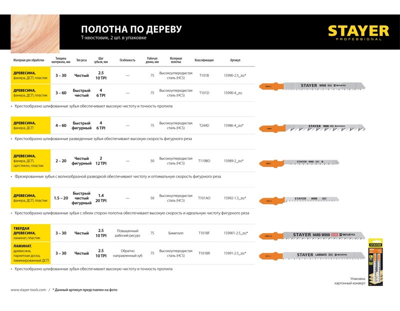 Полотна STAYER 15992-1.3_z02, применяются для высокоточного и быстрого распиливания древесины, фа-неры и пластмассы.