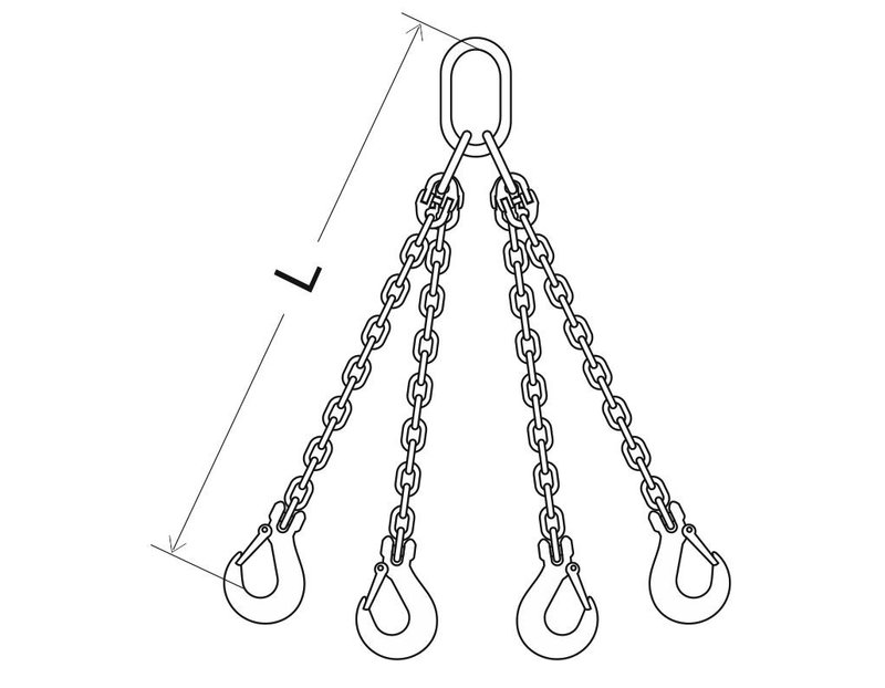 Строп цепной четырехветвевой типа 4СЦ представляет собой конструкцию, состоящую из овального звена с двумя подзвенниками, четырех отрезков грузовой цепи, соединенных со звеном специальными соединительными звеньями и четырех крюков (или иных грузозахватных органов), соединенных с цепью.