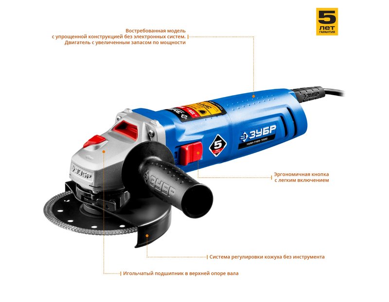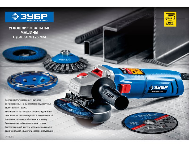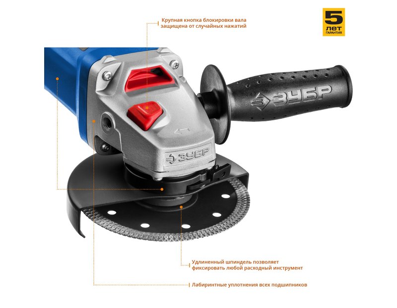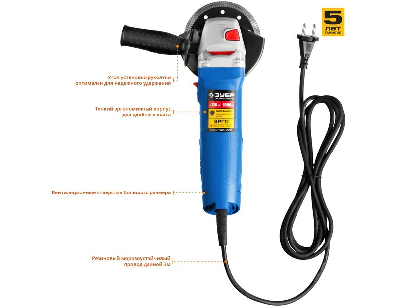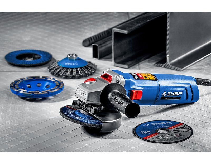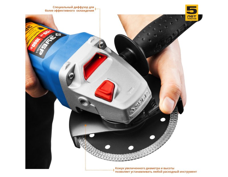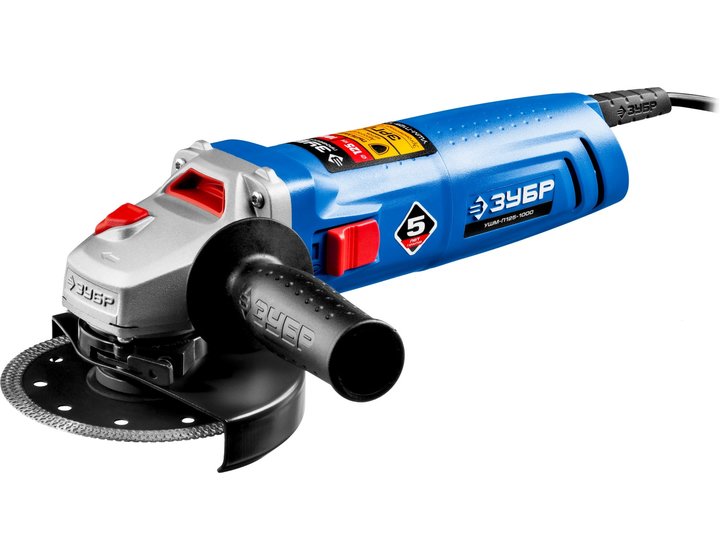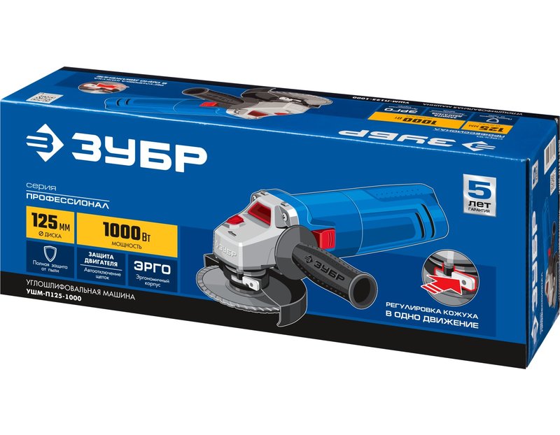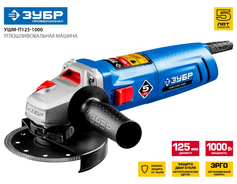 Угловая шлифмашина ЗУБР УШМ-П125-1000, предназначена для зачистки, шлифовки и резки металлов, обработки бетона и камня при установке соответствующих шлифовальных, отрезных, алмазных кругов. Надежная защита основных узлов от пыли. Специально разработанный корпус редуктора для улучшения теплоотвода и обеспечения прочности самого нагруженного узла. Направляющий диффузор в системе обдува способствует стабильности температуры основных компонентов. Низкий уровень шума за счет редуктора с косозубыми коническими шестернями. Поворотная с шагом 90° голова позволяет настроить изделие под левую руку или для резки. Защитный кожух диска с мгновенной регулировкой положения удобным рычажком в одно движение. Блокировка шпинделя для быстрой замены диска. Фланцы из разного материала предотвращают чрезмерное затягивание диска при работе. Легкое включение удобной кнопкой в одно движение. Специальная конструкция щеткодержателя, предотвращающая повреждение коллектора при полном износе щеток. Простой доступ к щеткам для замены.