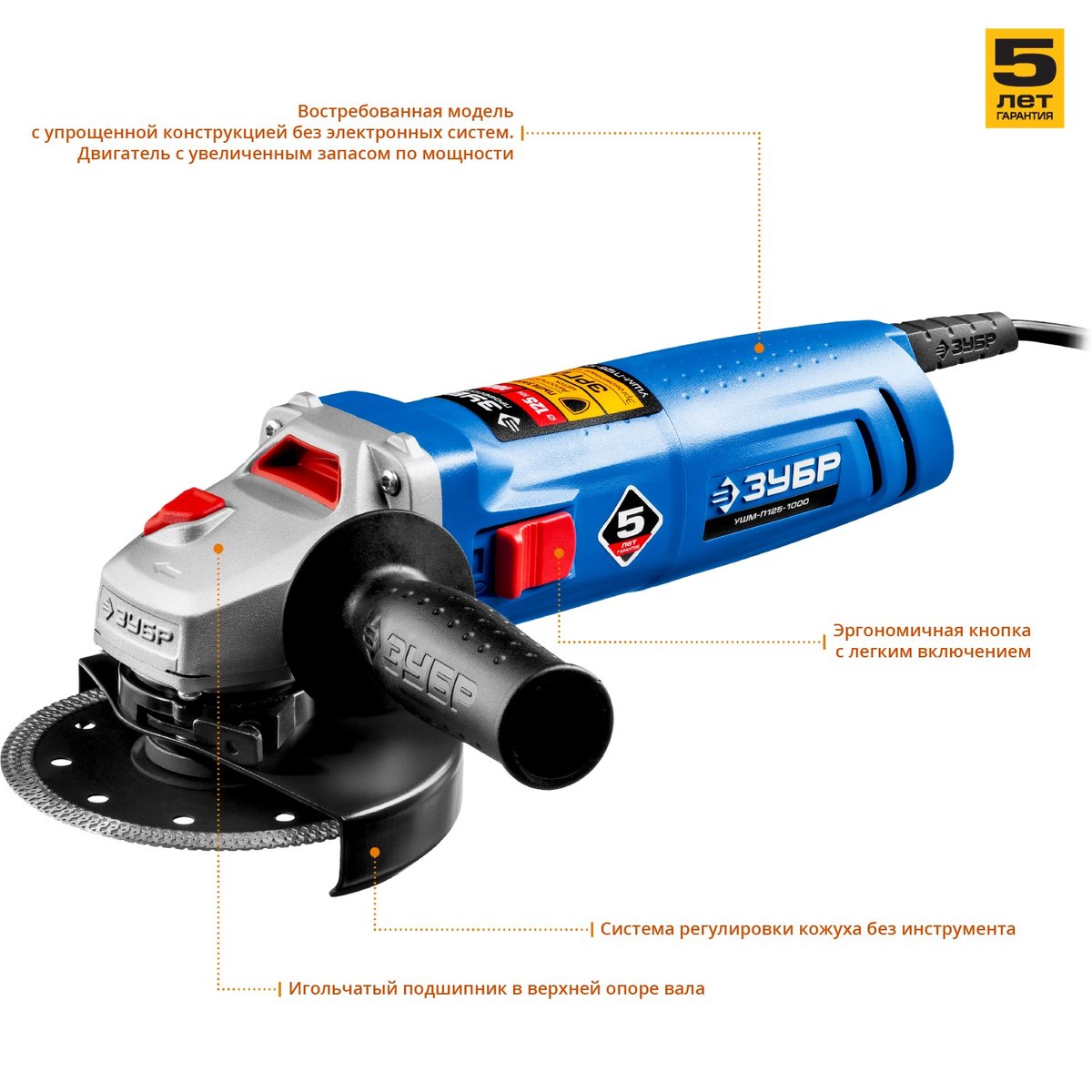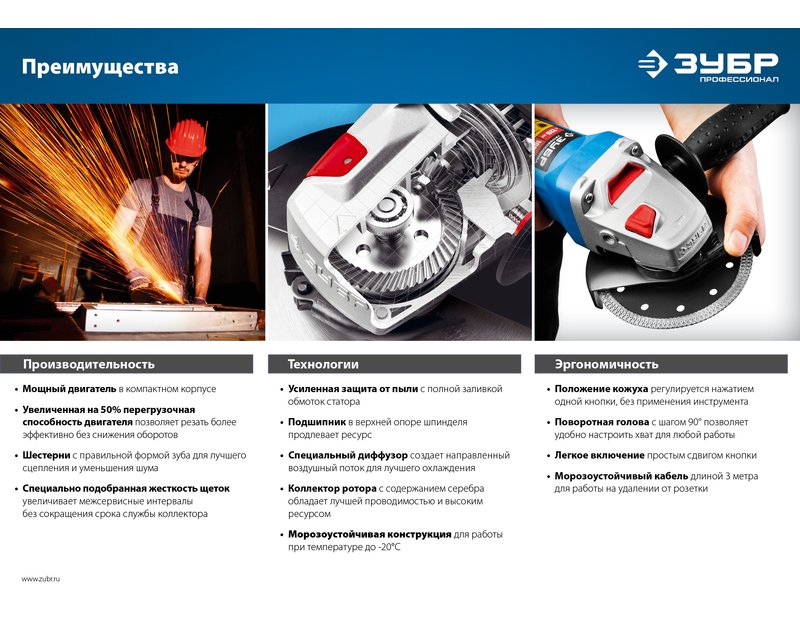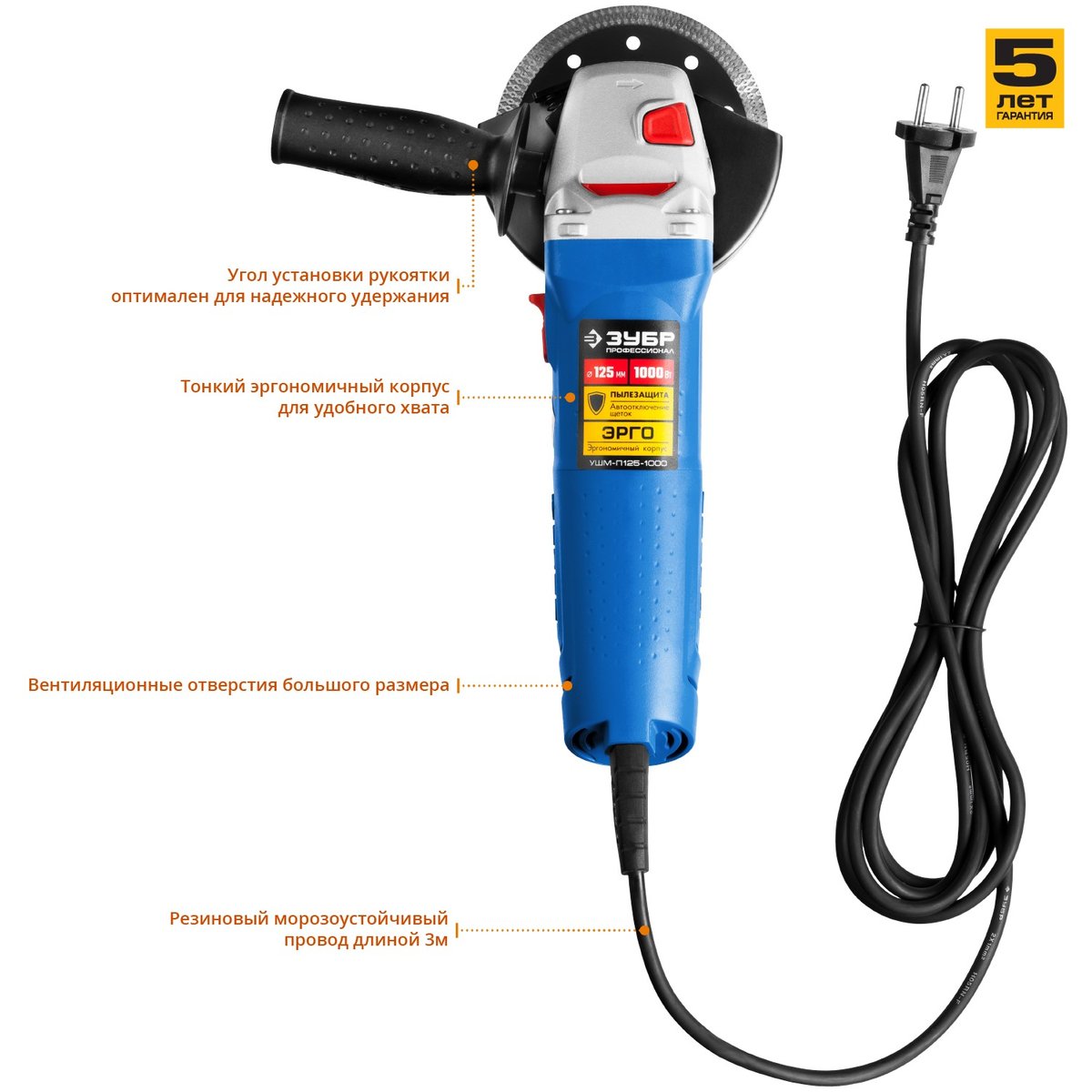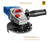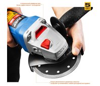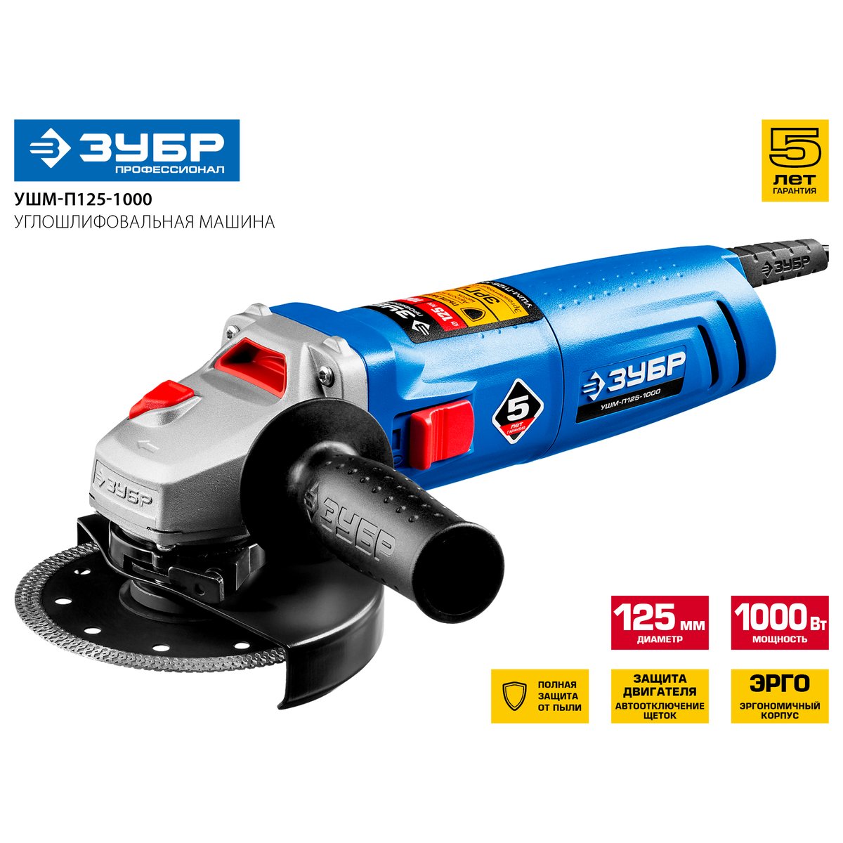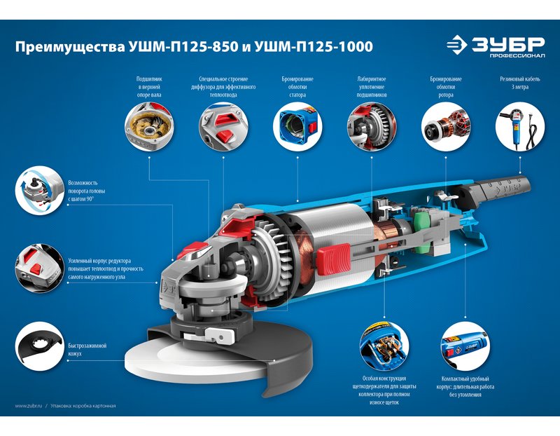 Угловая шлифмашина ЗУБР УШМ-П125-1000, предназначена для зачистки, шлифовки и резки металлов, обработки бетона и камня при установке соответствующих шлифовальных, отрезных, алмазных кругов. Надежная защита основных узлов от пыли. Специально разработанный корпус редуктора для улучшения теплоотвода и обеспечения прочности самого нагруженного узла. Направляющий диффузор в системе обдува способствует стабильности температуры основных компонентов. Низкий уровень шума за счет редуктора с косозубыми коническими шестернями. Поворотная с шагом 90° голова позволяет настроить изделие под левую руку или для резки. Защитный кожух диска с мгновенной регулировкой положения удобным рычажком в одно движение. Блокировка шпинделя для быстрой замены диска. Фланцы из разного материала предотвращают чрезмерное затягивание диска при работе. Легкое включение удобной кнопкой в одно движение. Специальная конструкция щеткодержателя, предотвращающая повреждение коллектора при полном износе щеток. Простой доступ к щеткам для замены.