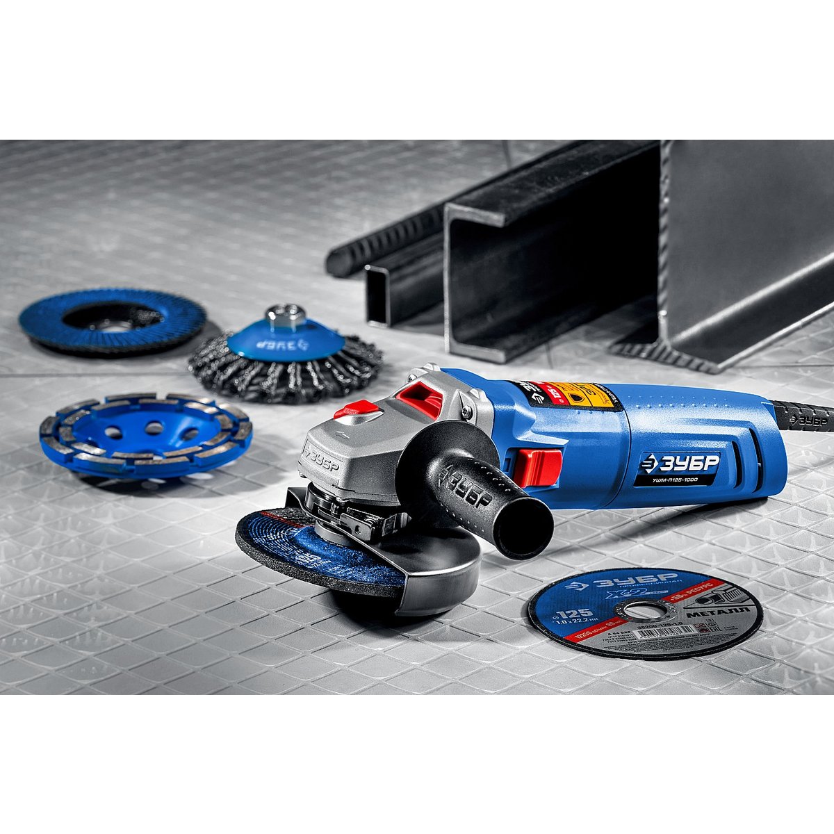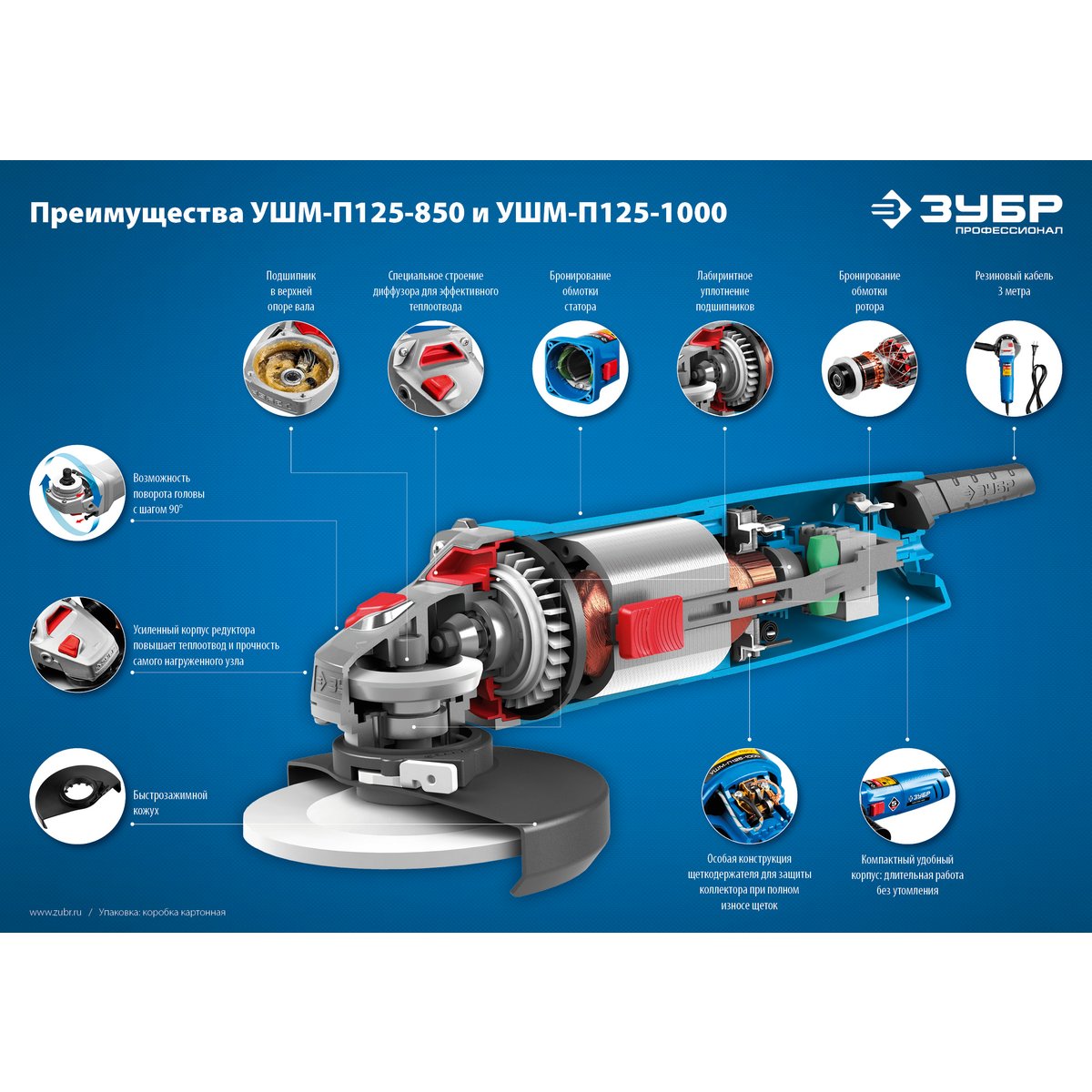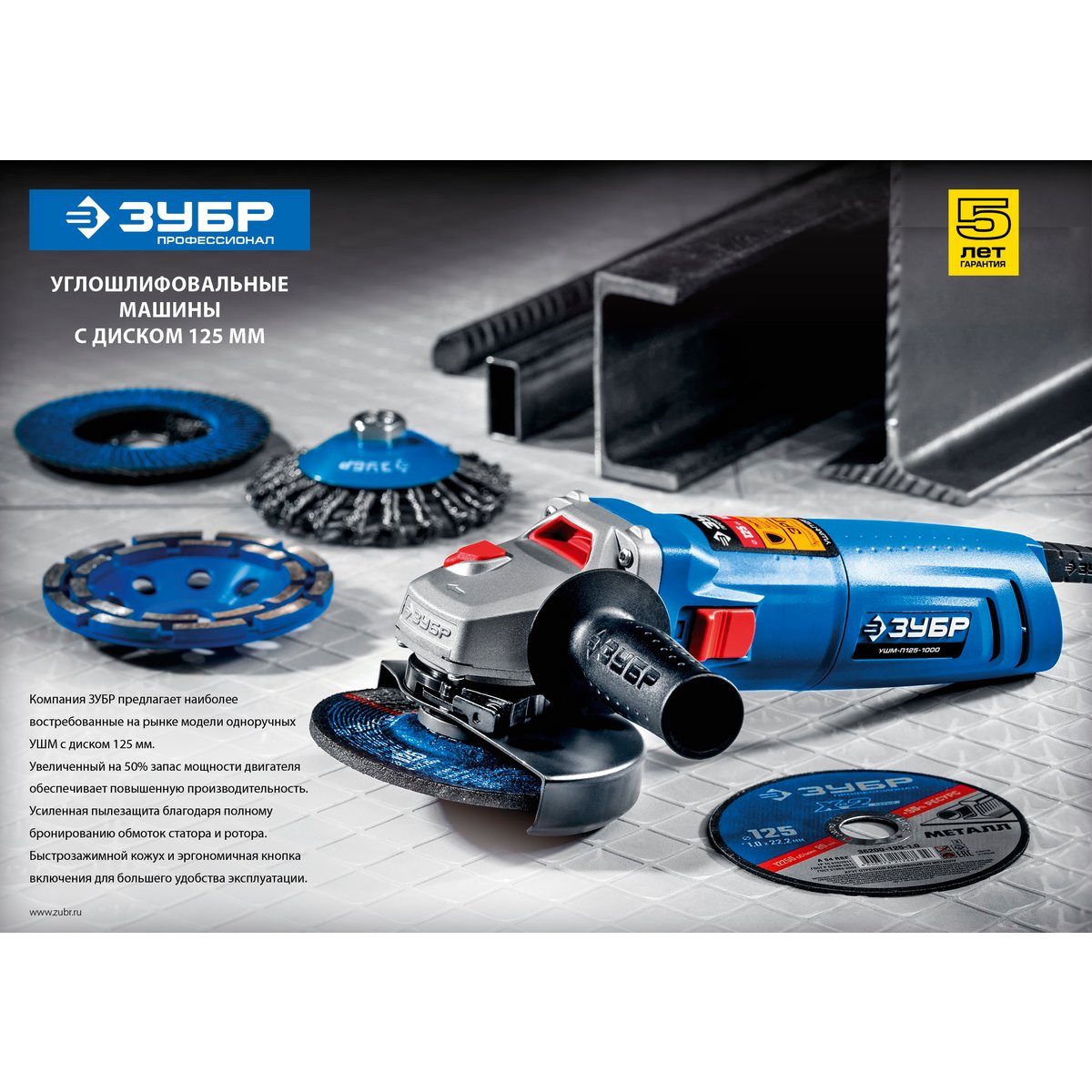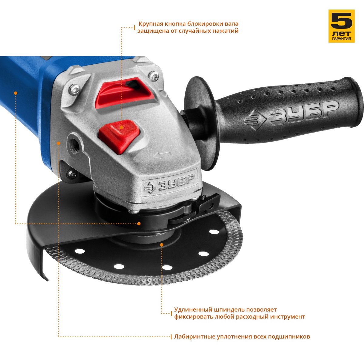 Угловая шлифмашина ЗУБР УШМ-П125-1000, предназначена для зачистки, шлифовки и резки металлов, обработки бетона и камня при установке соответствующих шлифовальных, отрезных, алмазных кругов. Надежная защита основных узлов от пыли. Специально разработанный корпус редуктора для улучшения теплоотвода и обеспечения прочности самого нагруженного узла. Направляющий диффузор в системе обдува способствует стабильности температуры основных компонентов. Низкий уровень шума за счет редуктора с косозубыми коническими шестернями. Поворотная с шагом 90° голова позволяет настроить изделие под левую руку или для резки. Защитный кожух диска с мгновенной регулировкой положения удобным рычажком в одно движение. Блокировка шпинделя для быстрой замены диска. Фланцы из разного материала предотвращают чрезмерное затягивание диска при работе. Легкое включение удобной кнопкой в одно движение. Специальная конструкция щеткодержателя, предотвращающая повреждение коллектора при полном износе щеток. Простой доступ к щеткам для замены.