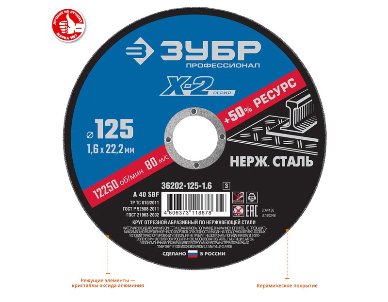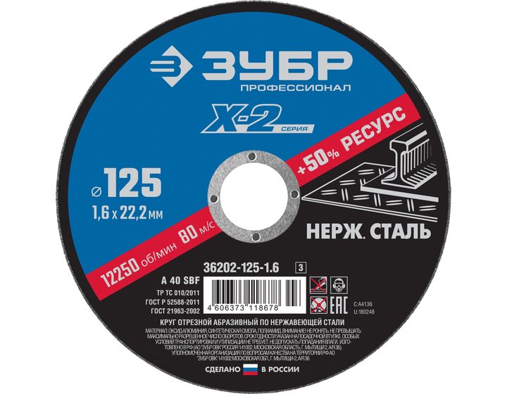 Круг отрезной по нержавеющей стали ЗУБР 36202-125-1.6_z03, предназначен для резки деталей и заготовок из нержавеющей стали, листовой нержавеющей стали, а также вязких сплавов из цветных металлов. Возможность использования в пищевой промышленности. Двойной ресурс. Комфортный рез нержавеющей стали. Стабильное искрообразование.
