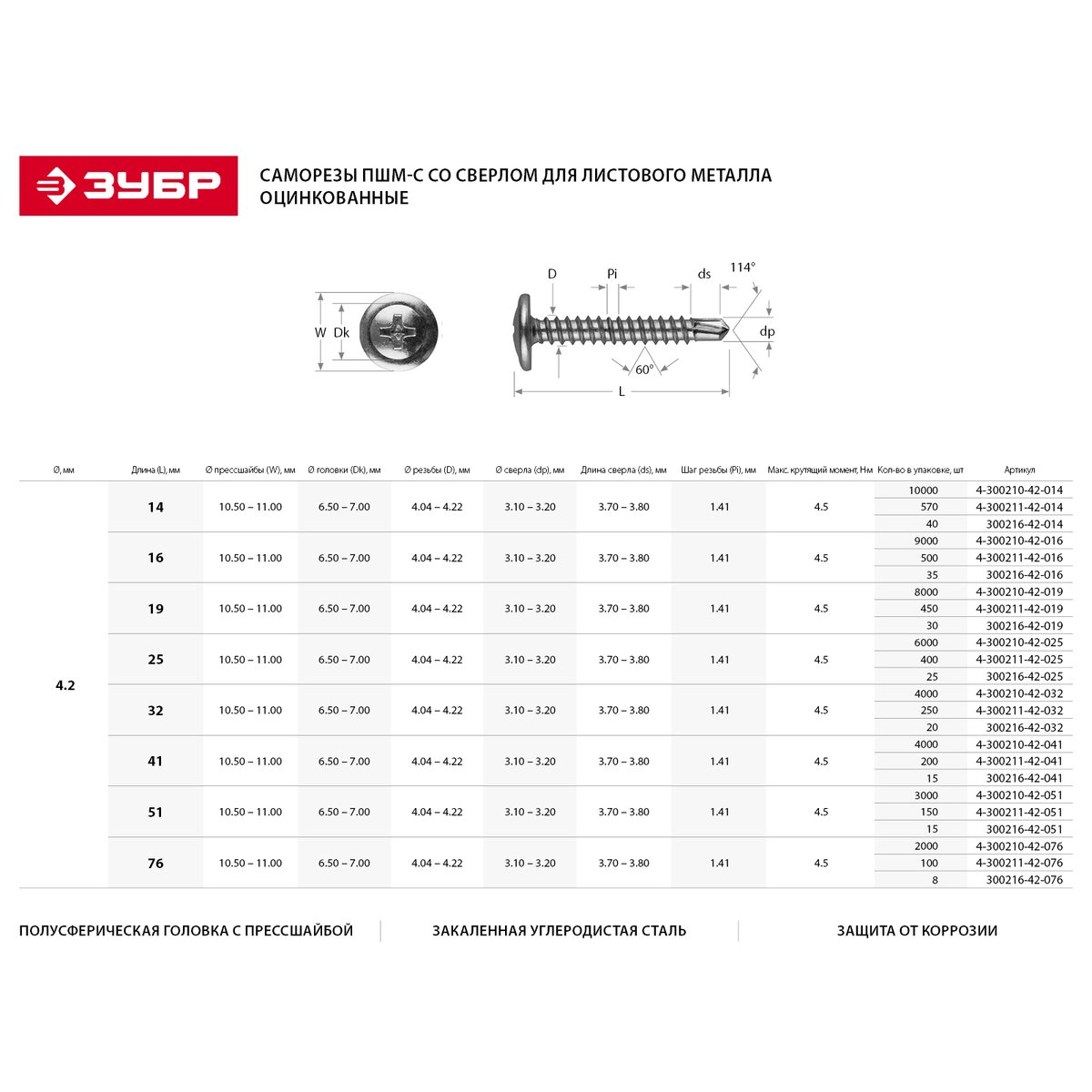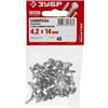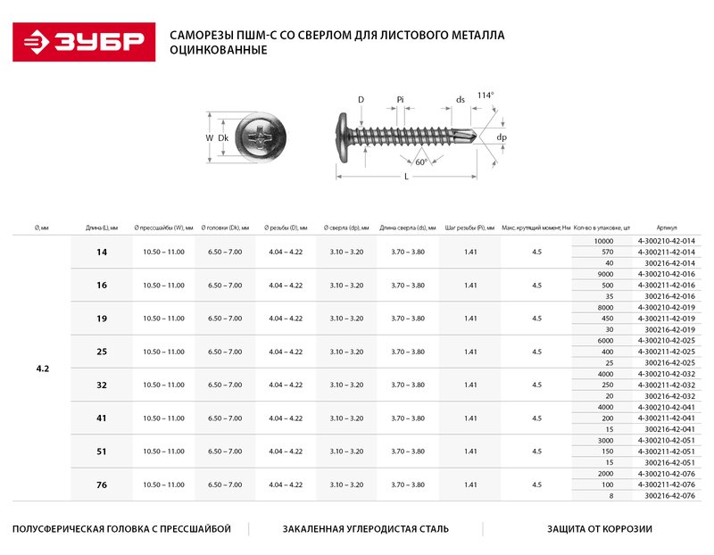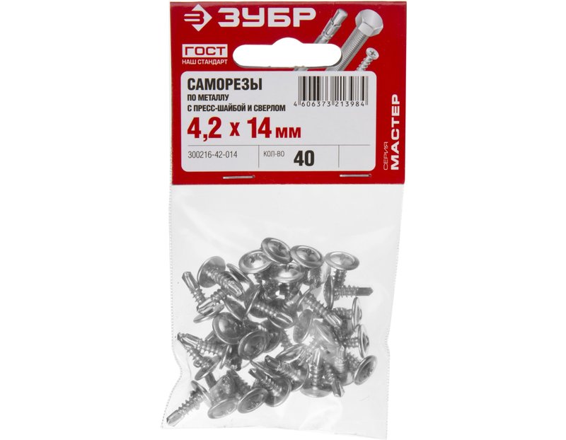 Саморезы для листового металла ЗУБР 300216-42-014, применяются для крепления тонких листов металла, профилей, пластика и др. к листовому металлу толщиной до 2 мм. Саморезы с прессшайбой изготовлены из высококачественной стали, прошедшей термическую обработку. Находят широкое применение при выполнении бытового ремонта, сборке и установке различных конструкций. Наконечник в виде сверла позволяет крепить элементы конструкций к металлу толщиной до 2 мм без предварительного сверления. Полусферическая головка с прессшайбой позволяет скреплять мягкие материалы, увеличивая площадь опорной поверхности и предотвращая продавливание. Цинковое покрытие обеспечивает защиту от коррозии.