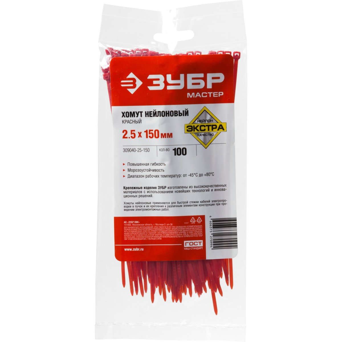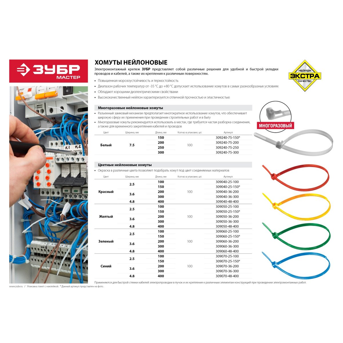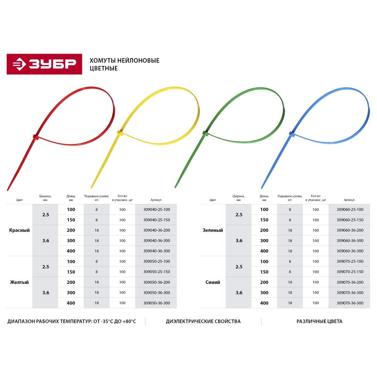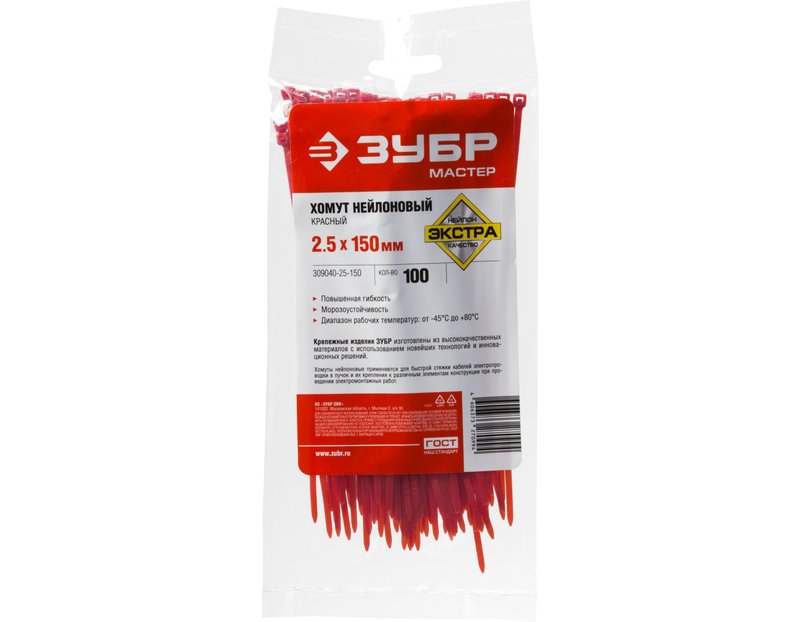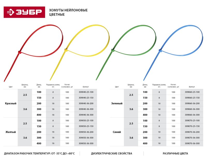 Пластиковые хомуты ЗУБР 309040-25-150, предназначены для быстрой стяжки кабелей электропроводки в пучок и их крепления к различным элементам конструкции при проведении электромонтажных работ. Пластиковые хомуты (стяжки) имеют очень широкий спектр применения при проведении строительных и ремонтных работ. Изготовлены из высококачественного прочного и эластичного нейлона. Окраска в различные цвета позволяет подобрать хомут под цвет соединяемых материалов. Отличаются повышенной морозоустойчивостью и термостойкостью. Диапазон рабочих температур от -35°С до +80°С допускает использование хомутов в самых разнообразных условиях. Обладают хорошими диэлектрическими свойствами.