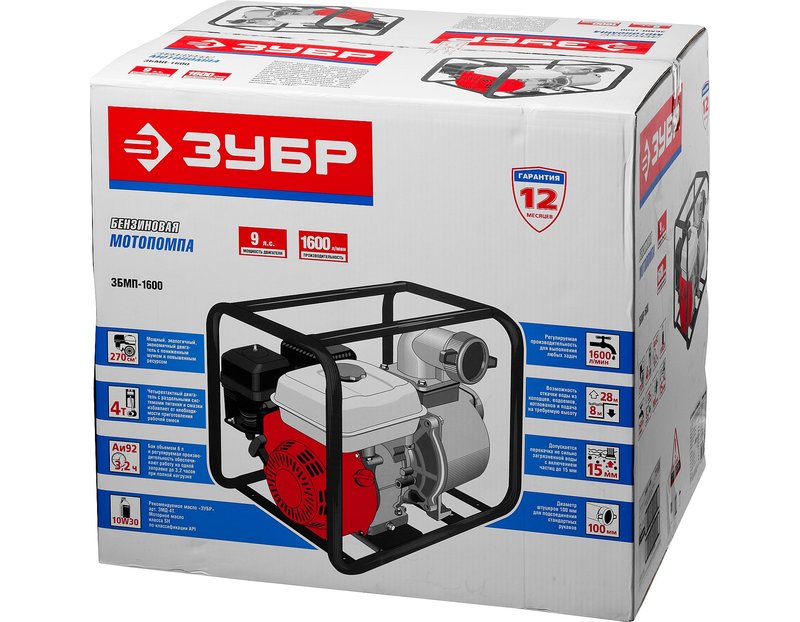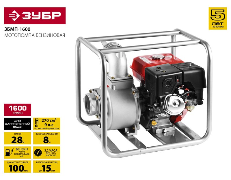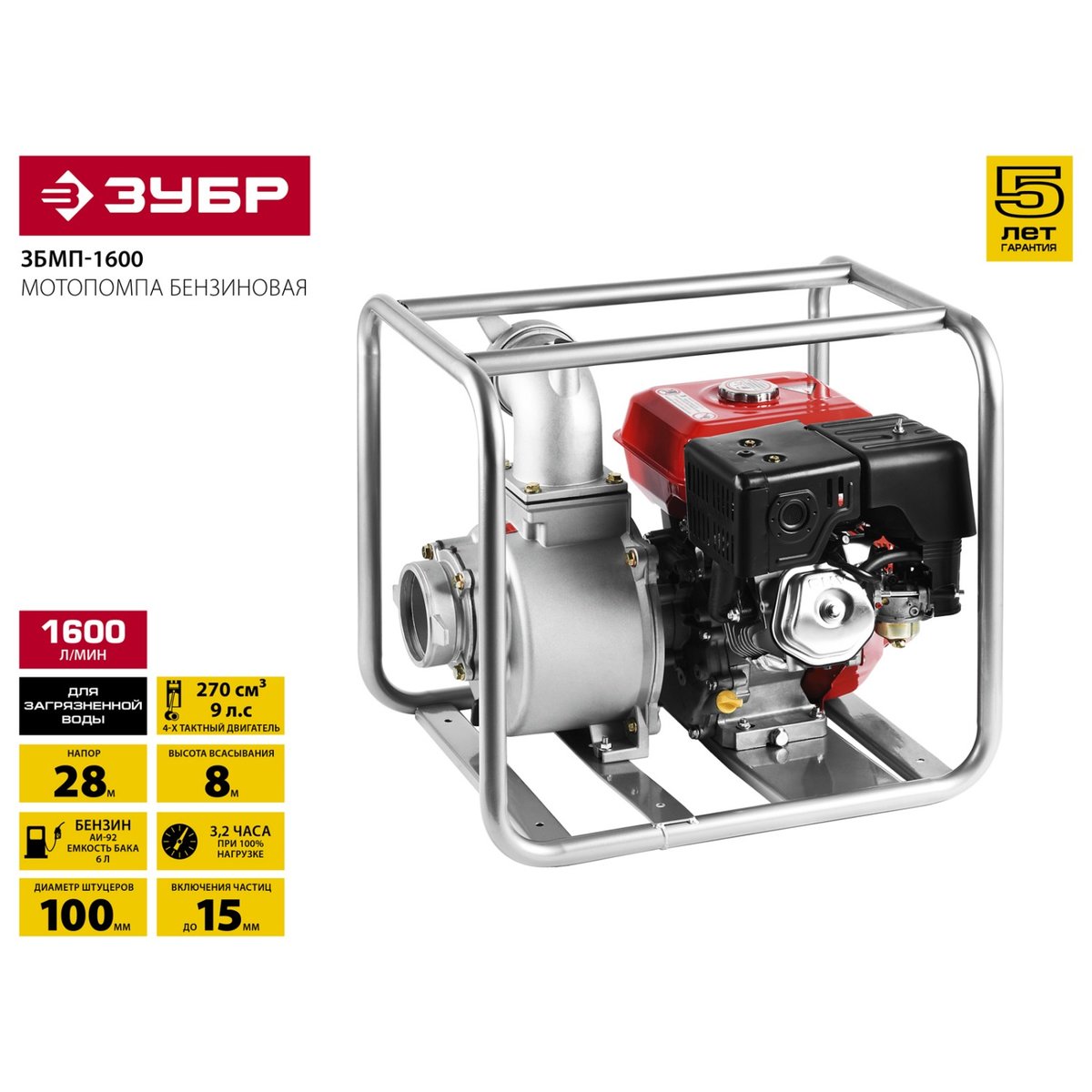 Мотопомпа бензиновая ЗУБР ЗБМП-1600, предназначена для откачки (перекачки) воды из водоемов, подвалов, котлованов, емкостей и т.п. Также может использоваться в качестве нагнетающего агрегата для подачи воды при организации полива, заправки емкостей и т.п. Мощная мотопомпа, способная справиться с любой работой. Оптимальна для использования при устранении любых чрезвычайных ситуаций. Экологичный, экономичный двигатель с пониженным шумом и повышенным ресурсом. Бак объемом 3,6 л и регулируемая производительность обеспечивают работу на одной заправке до 3 часов при полной нагрузке. Четырехтактный двигатель с раздельными системами питания и смазки избавляет от необходимости приготовления рабочей смеси. Регулируемая производительность для выполнения любых задач. Штуцеры для подсоединения стандартных рукавов. Допускается перекачка не сильно загрязненной воды с включением частиц до 15 мм.