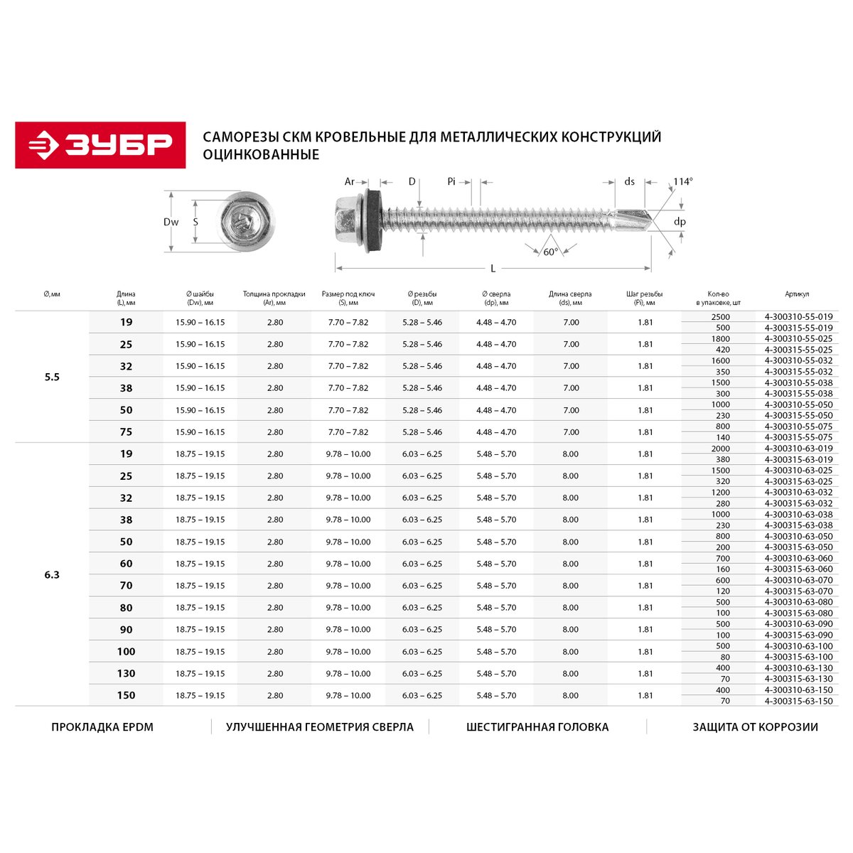 Саморезы кровельные ЗУБР 4-300315-55-019-3005, предназначены для крепления кровельных материалов к деревянной обрешетке (металлическим конструкциям). Кровельные саморезы изготовлены из высококачественной стали, прошедшей термическую обработку. Шайба с прокладкой EPDM плотно прижимается к кровельному материалу, герметизируя просверленное отверстие. Шестигранная головка позволяет создать большой крутящий момент и значительно облегчает вкручивание самореза. Находят широкое применение при выполнении бытового ремонта, строительстве, сборке и установке различных конструкций. Прокладка EPDM сохраняет свои свойства при частых изменениях нагрузок, температуры и воздействии УФ излучения. Порошковая окраска по стандарту RAL позволяет подобрать саморезы под цвет кровли. Улучшенная геометрия сверла обеспечивает быстроту и легкость сверления в черепице и листовых кровельных материалах. Цинковое покрытие надежно защищает от коррозии.