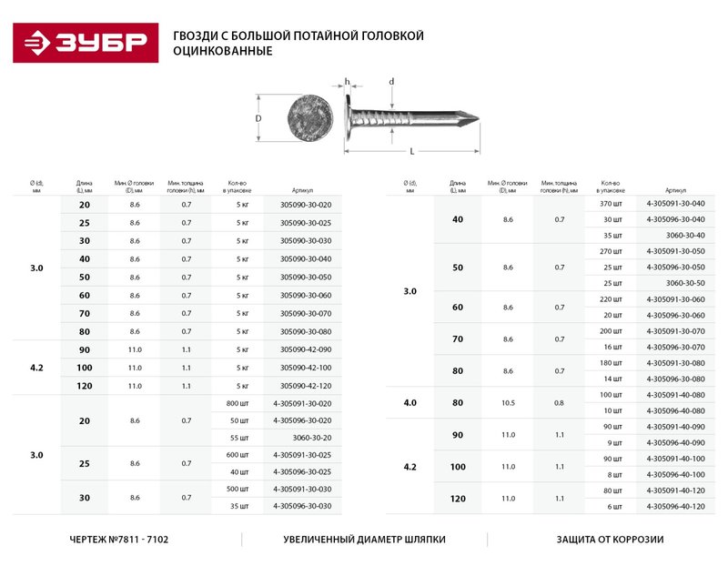 Гвозди с большой потайной головкой ЗУБР 4-305091-30-020, применяются при сборке различных конструкций с использованием дерева. Гвозди с большой потайной головкой изготовлены из высококачественной стали в строгом соответствии с действующими стандартами. Большая головка гвоздя позволяет надежно крепить листовые, в том числе мягкие материалы, не повреждая их. Цинковое покрытие надежно защищает от коррозии.