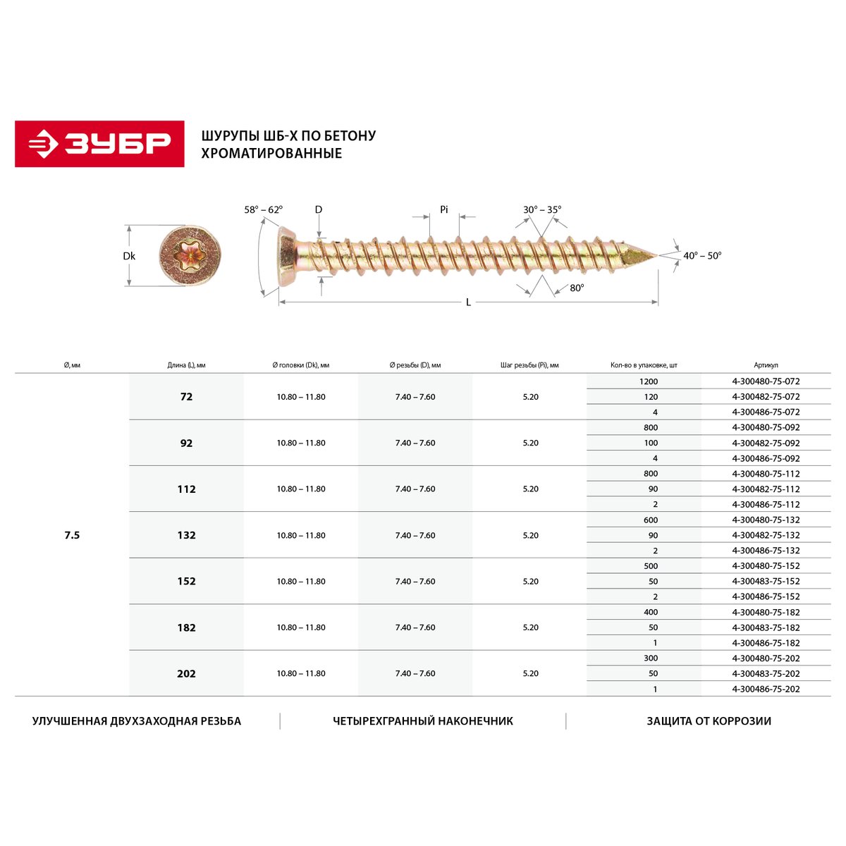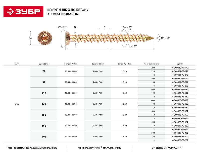 Шуруп ЗУБР 4-300483-75-202, применяется при выполнении бытового ремонта, сборке и установке различных конструкций. Шурупы по бетону изготовлены из стального прутка с высоким содержанием углерода. Контроль за геометрией шурупа начинается с калибровки прутка и заканчивается тщательной проверкой размеров готового изделия. Улучшенная геометрия и специально разработанная форма резьбы предназначены для жесткой фиксации конструкций в бетоне. Перед вкручиванием шурупа требуется предварительное сверление.