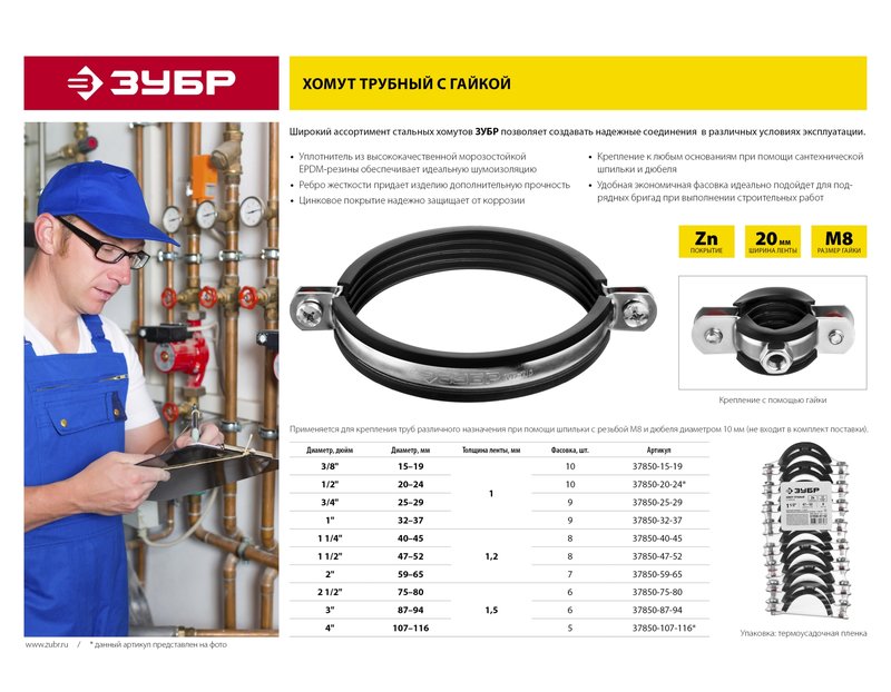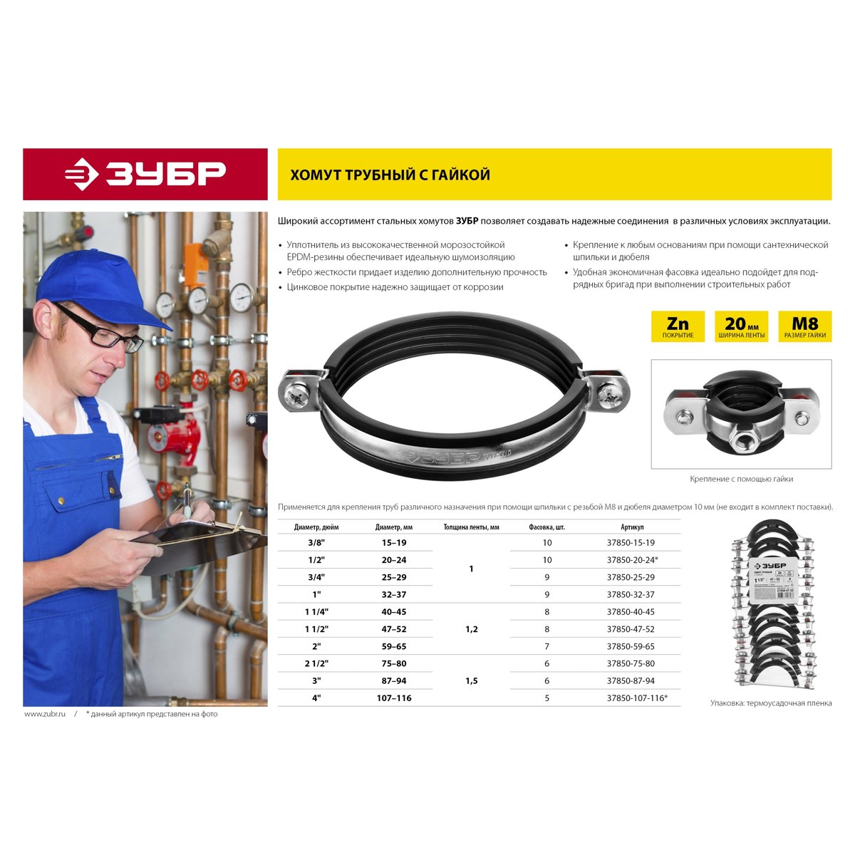 Хомут трубный с гайкой ЗУБР 37850-25-29, предназначен для крепления труб различного назначения к любым основаниям. Труба прочно фиксируется внутри хомута с помощью метрических винтов. Уплотнитель из высококачественной резины обеспечивает идеальную шумоизоляцию.