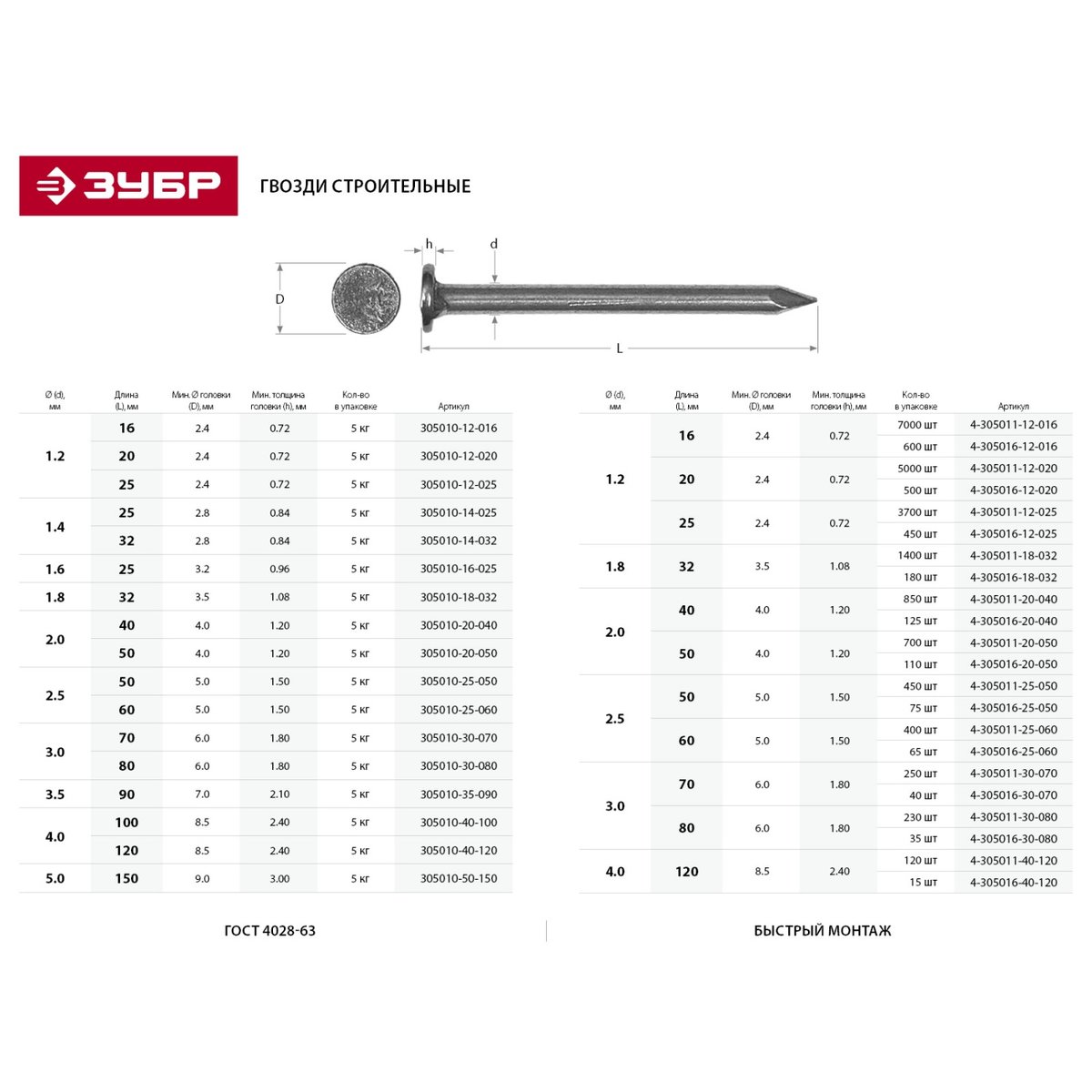 Гвозди 305010-25-050 являются самым распространенным и удобным крепежом при сборке различных конструкций с использованием дерева. Строительные гвозди изготовлены из высококачественной стали в строгом соответствии с действующими стандартами. Быстрый и легкий монтаж: гвоздь просто забивается молотком через прикрепляемую деталь. Для сборки деревянных конструкций, крепления тонколистового металла до 0.9 мм.