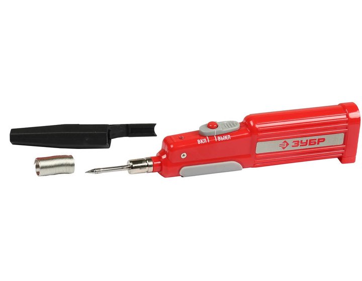 Беспроводной паяльник ЗУБР 55410, предназначен для работы в тех местах, где нет возможности подключиться к сети 220 В. Например, при выполнении паяльных работ в высоко расположенной распаячной коробке, электрическом щитке, или при пайке провода на даче, в сарае, в гараже. Может применяться при работе с проводкой автомобиля, пригодится радиомонтажникам, мастерам-электрикам.