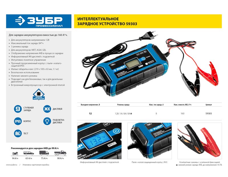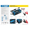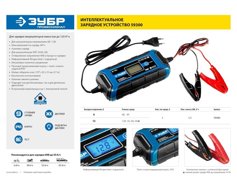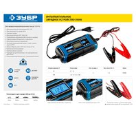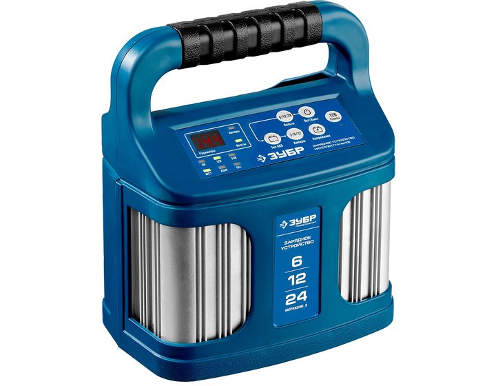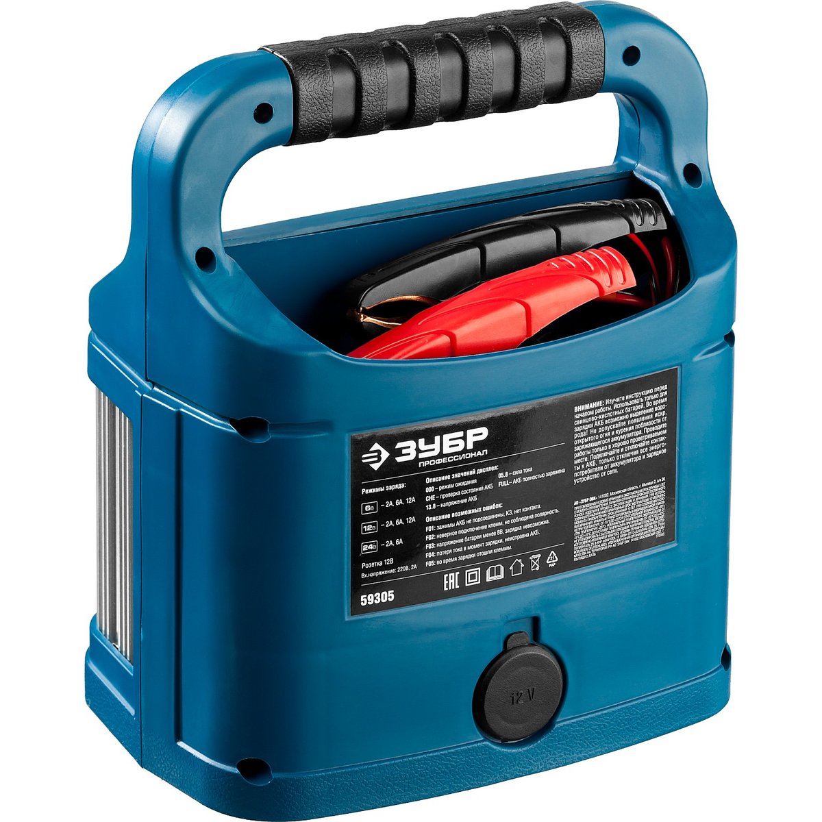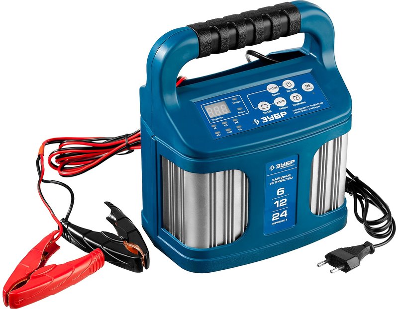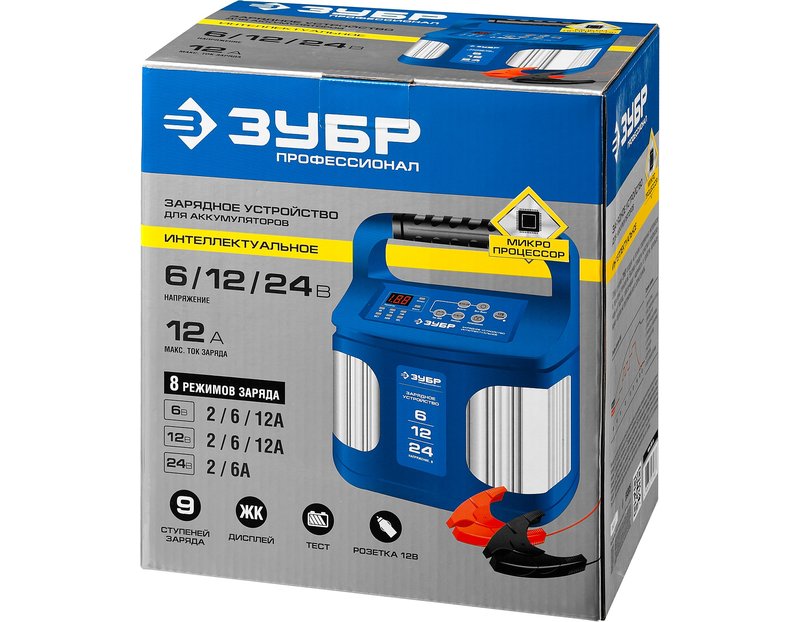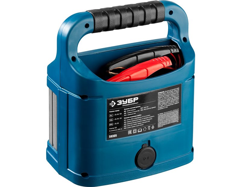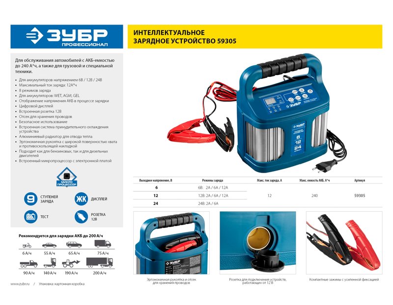 Зарядное устройство ЗУБР 59305, предназначено для зарядки аккумуляторных батарей легковых и грузовых автомобилей, мотоциклов и т.д. с напряжение 6, 12 и 24 В. Тип заряжаемых аккумуляторов: WET/GEL/AGM. Устройство является полностью автоматическим. Прочный корпус зарядного устройства защищает внутренние элементы от случайных повреждений. На лицевой панели устройства предусмотрены цифровой дисплей, который отображает рабочие параметры, и индикаторы, которые сигнализируют о ходе процесса зарядки. Устройство имеет 9 режима работы, включая режим зимнего использования и 9 этапов процесса зарядки, а также функция поддержания АКБ в заряженном состоянии - режим хранения. Имеется встроенная розетка на 12 В. Специальные зажимы обеспечивают быстрое подключение и надежность контактов (без потерь). Зарядное устройство обладают высокой эффективностью и имеют защиту от ошибок, перегрева и короткого замыкания. Есть функция памяти.