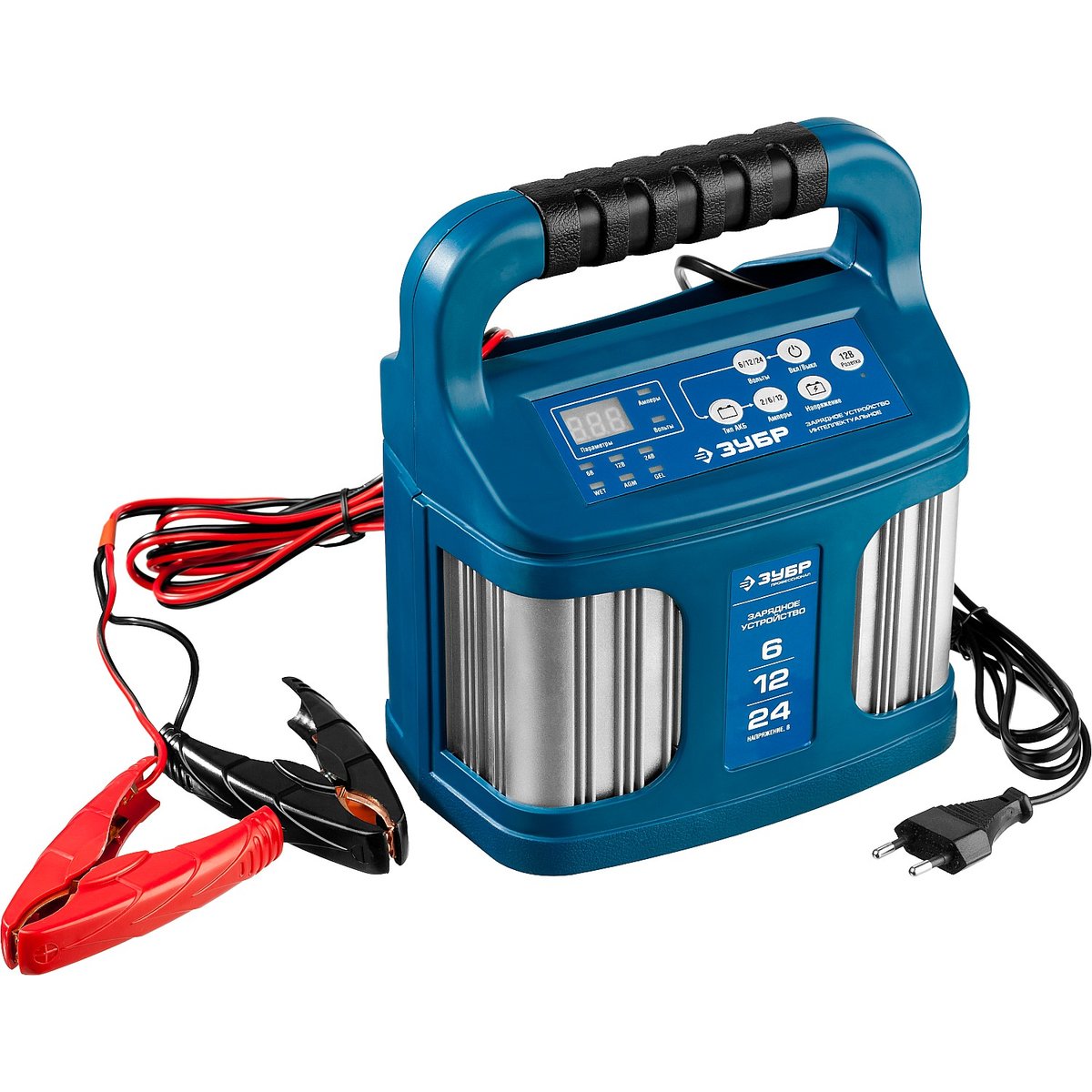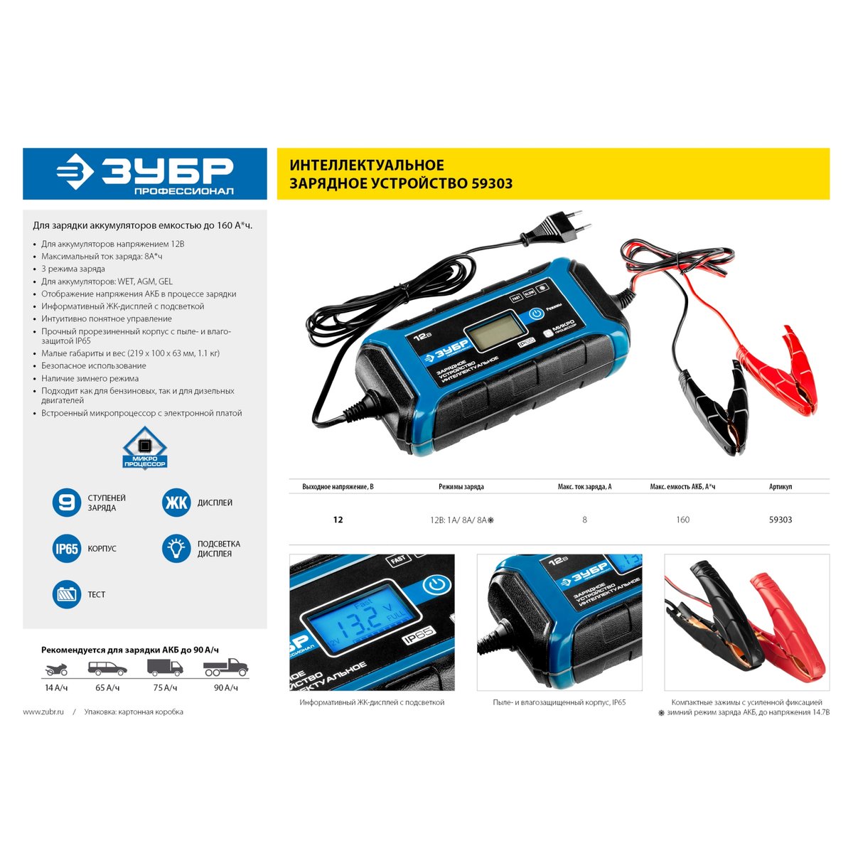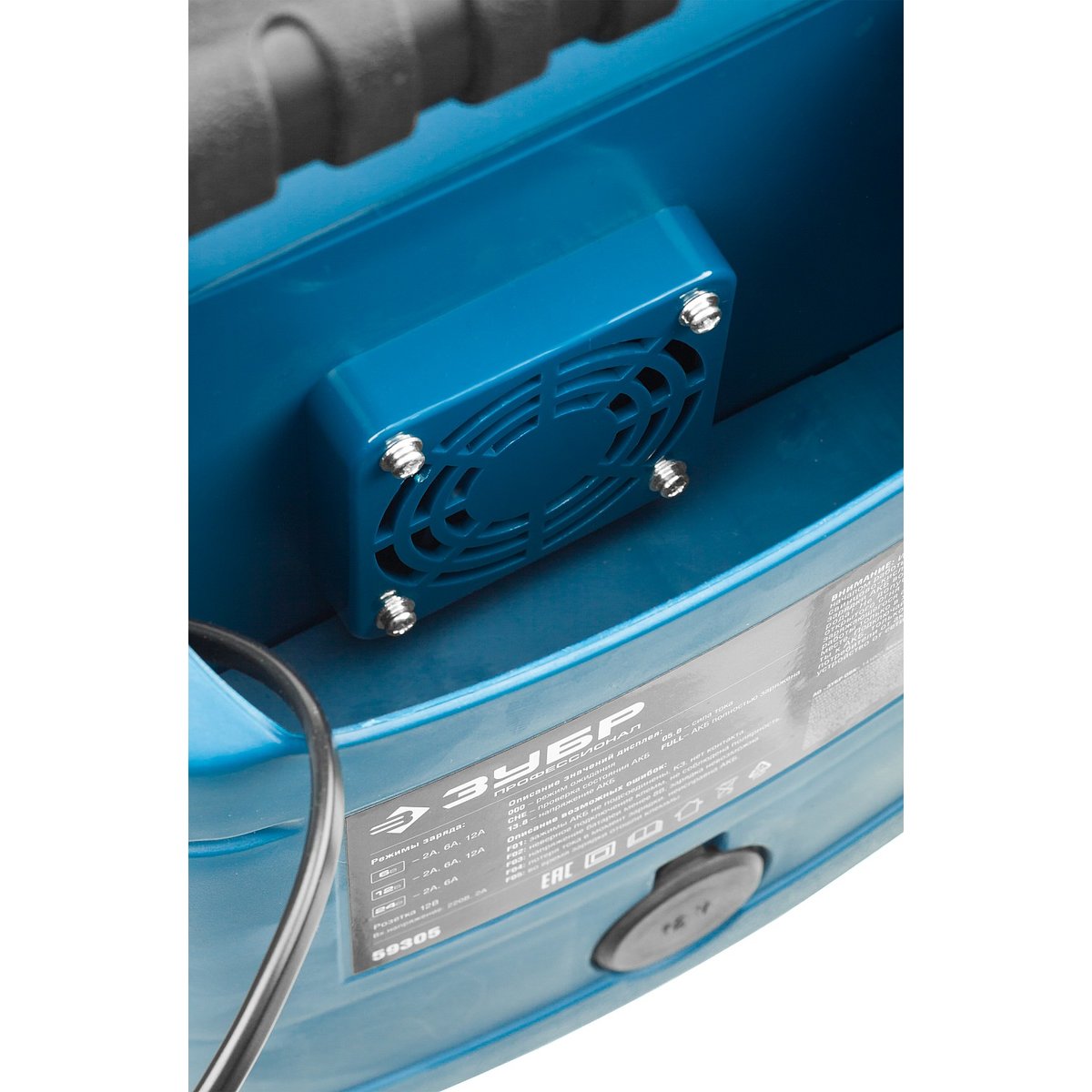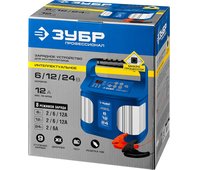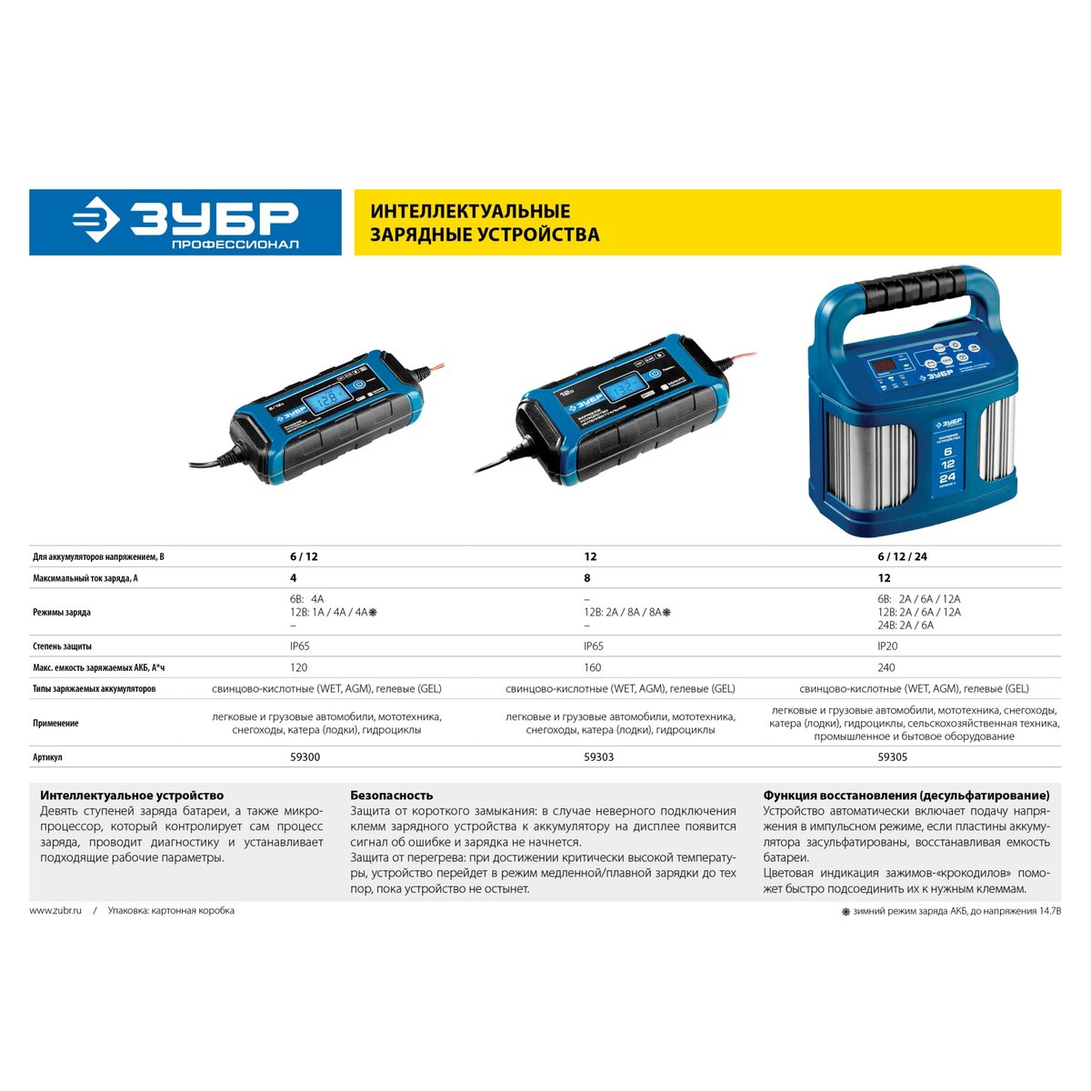 Зарядное устройство ЗУБР 59305, предназначено для зарядки аккумуляторных батарей легковых и грузовых автомобилей, мотоциклов и т.д. с напряжение 6, 12 и 24 В. Тип заряжаемых аккумуляторов: WET/GEL/AGM. Устройство является полностью автоматическим. Прочный корпус зарядного устройства защищает внутренние элементы от случайных повреждений. На лицевой панели устройства предусмотрены цифровой дисплей, который отображает рабочие параметры, и индикаторы, которые сигнализируют о ходе процесса зарядки. Устройство имеет 9 режима работы, включая режим зимнего использования и 9 этапов процесса зарядки, а также функция поддержания АКБ в заряженном состоянии - режим хранения. Имеется встроенная розетка на 12 В. Специальные зажимы обеспечивают быстрое подключение и надежность контактов (без потерь). Зарядное устройство обладают высокой эффективностью и имеют защиту от ошибок, перегрева и короткого замыкания. Есть функция памяти.
