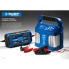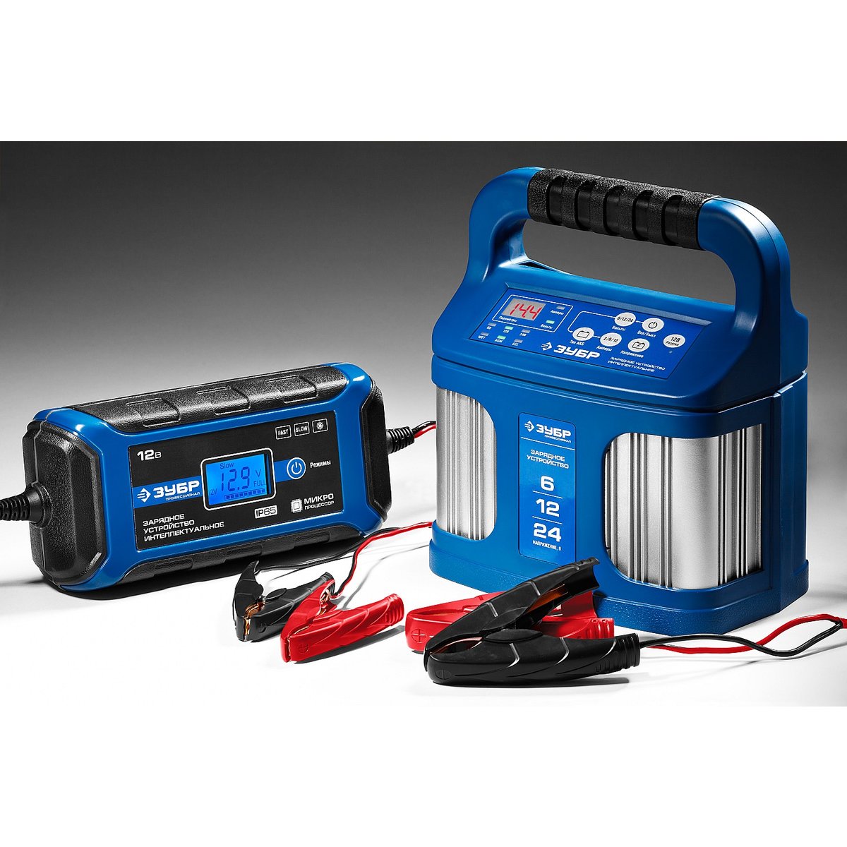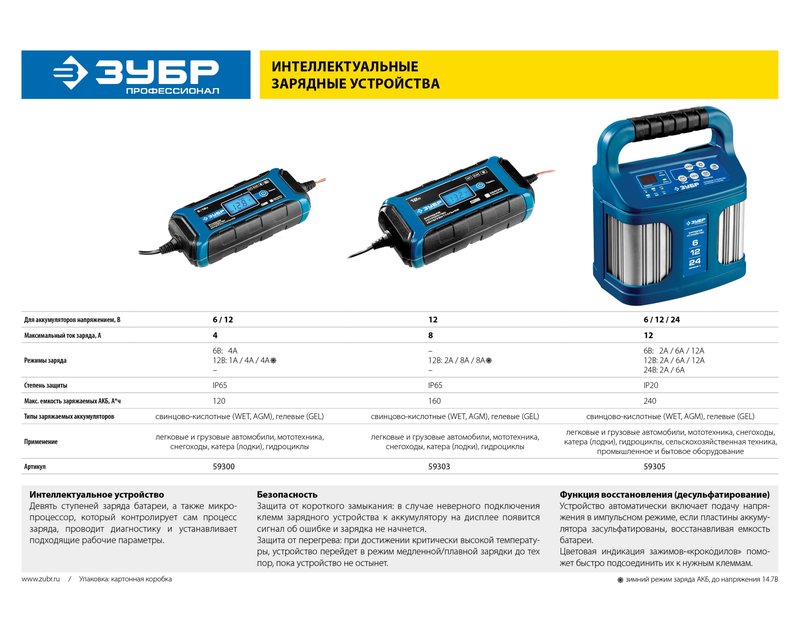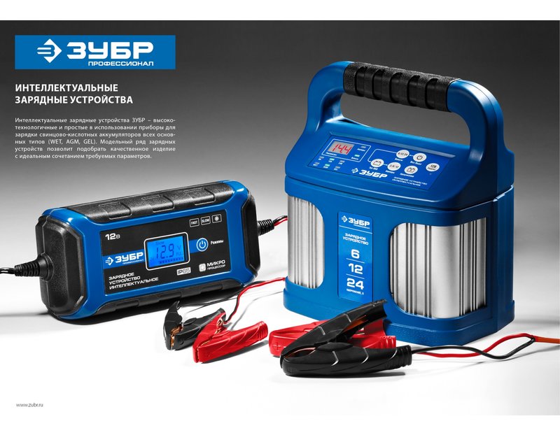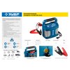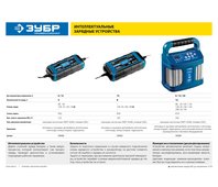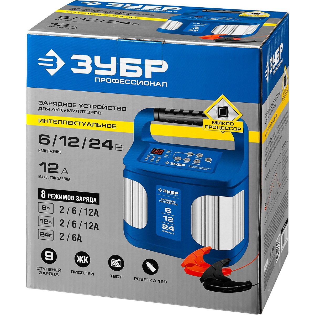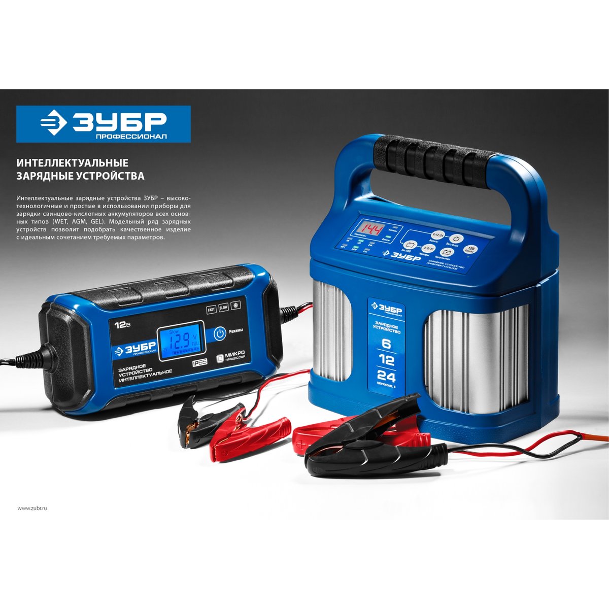 Зарядное устройство ЗУБР 59305, предназначено для зарядки аккумуляторных батарей легковых и грузовых автомобилей, мотоциклов и т.д. с напряжение 6, 12 и 24 В. Тип заряжаемых аккумуляторов: WET/GEL/AGM. Устройство является полностью автоматическим. Прочный корпус зарядного устройства защищает внутренние элементы от случайных повреждений. На лицевой панели устройства предусмотрены цифровой дисплей, который отображает рабочие параметры, и индикаторы, которые сигнализируют о ходе процесса зарядки. Устройство имеет 9 режима работы, включая режим зимнего использования и 9 этапов процесса зарядки, а также функция поддержания АКБ в заряженном состоянии - режим хранения. Имеется встроенная розетка на 12 В. Специальные зажимы обеспечивают быстрое подключение и надежность контактов (без потерь). Зарядное устройство обладают высокой эффективностью и имеют защиту от ошибок, перегрева и короткого замыкания. Есть функция памяти.