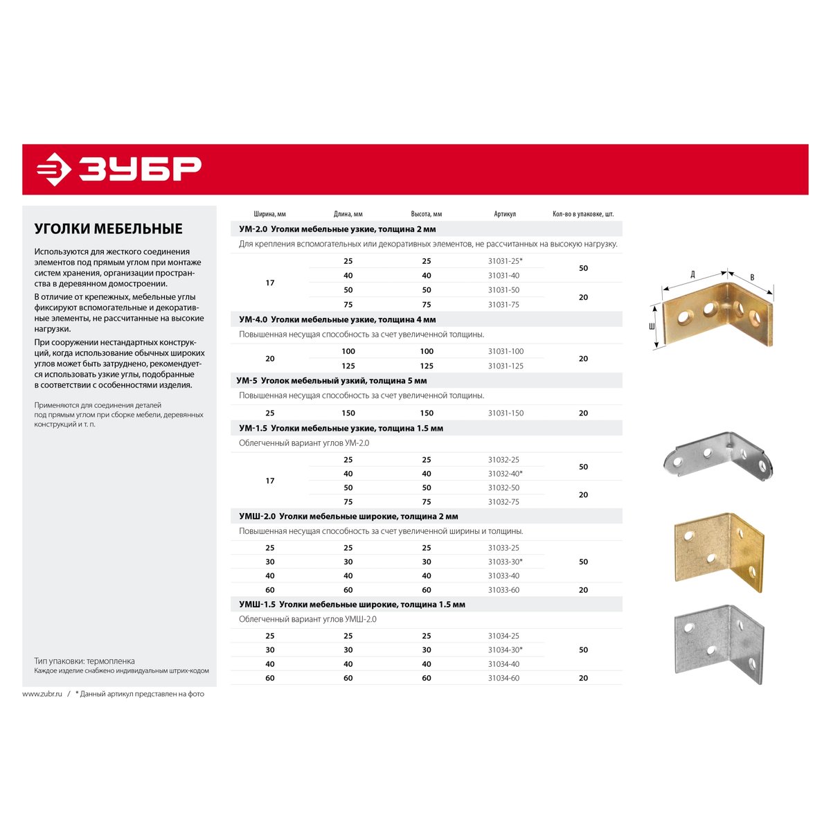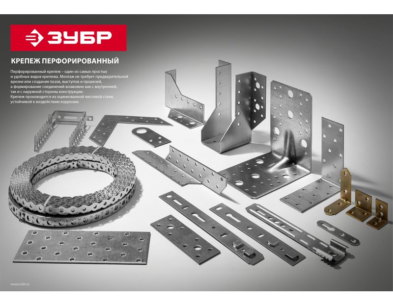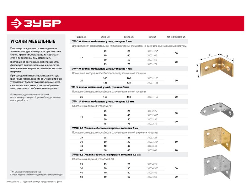Уголок мебельный ЗУБР 31032-75, предназначен для жесткого соединения различных элементов под прямым углом. Они используются при монтаже систем хранения, организации пространства в подсобных помещениях, а также в деревянном домостроении. Крепежные отверстия имеют стандартный размер под гвоздь или саморез. Изготовлены из конструкционной листовой стали Ст2пс. Цинковое покрытие надежно защищает от коррозии.