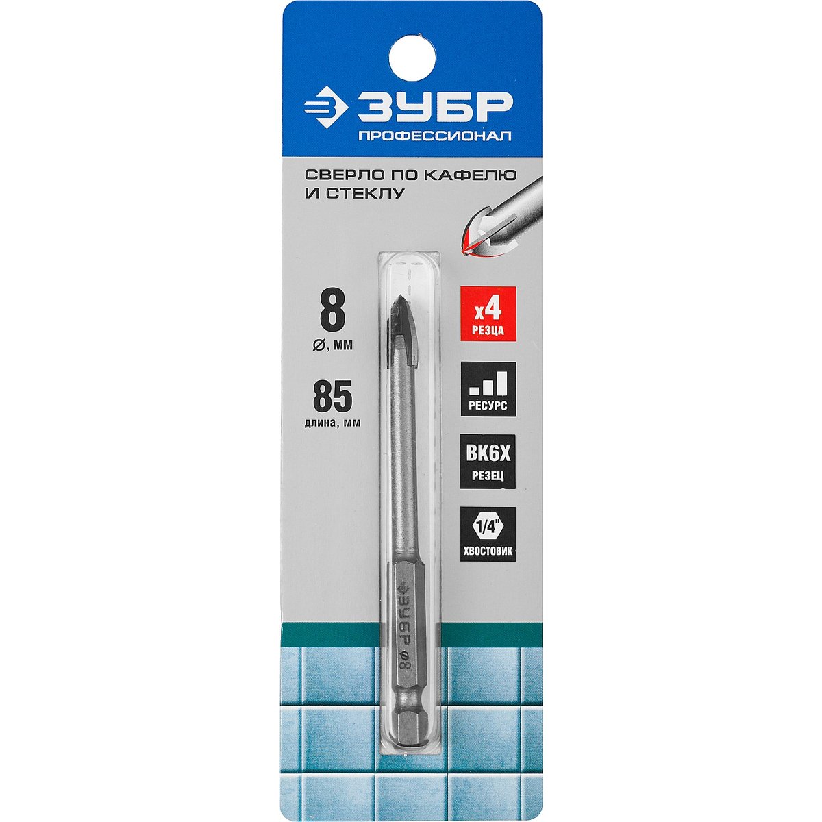 Сверло по кафелю и стеклу 8 мм ЗУБР 29845-08_z01, применяется для сверления отверстий в стекле, керамической и кафельной плитке, мраморе. Четыре резца. Благодаря четырём режущим лезвиям сверление осуществляется в два раза эффективней. Наконечник сверла из твердого сплава BK6Х. Специальная заточка режущих кромок улучшает прохождение материала. Шестигранный хвостовик для предотвращения проворачивания в сверлильном патроне. Специальная проточка хвостовика 1/4" для использования быстросъемных адаптеров.
