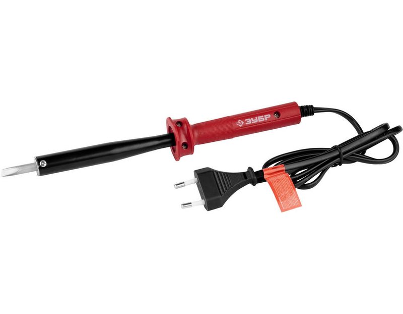 Электропаяльник непрерывного нагрева ЗУБР 55400-80_z01, предназначен для монтажа электронных компонентов, пайки медных проводников сечением до 1,5 мм?, отпайки и лужения металлических элементов толщиной до 0,8 мм.