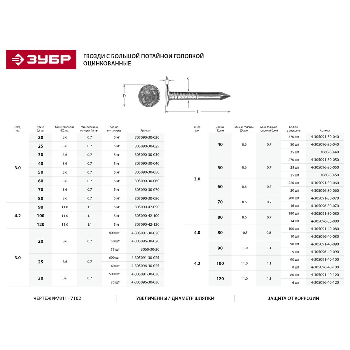 Гвозди с большой потайной головкой ЗУБР 4-305091-40-090, применяются при сборке различных конструкций с использованием дерева. Гвозди с большой потайной головкой изготовлены из высококачественной стали в строгом соответствии с действующими стандартами. Большая головка гвоздя позволяет надежно крепить листовые, в том числе мягкие материалы, не повреждая их. Цинковое покрытие надежно защищает от коррозии.