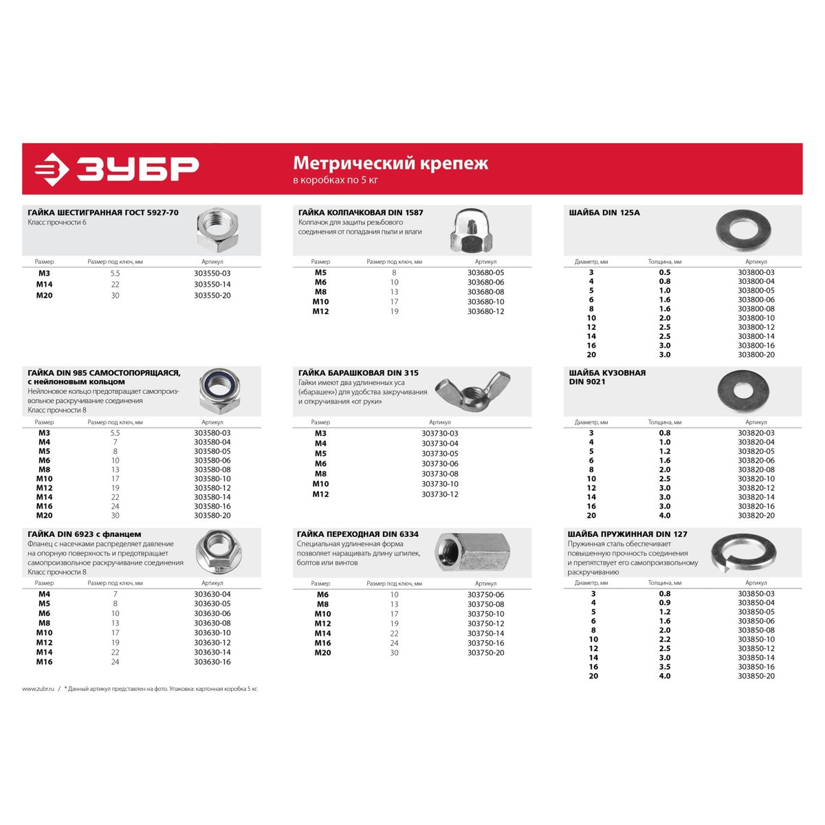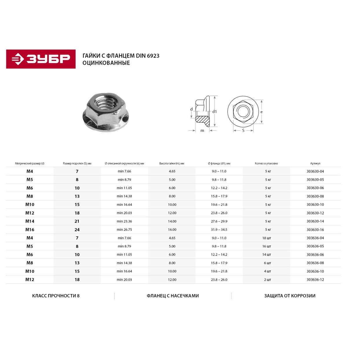 Гайка DIN 6923 с фланцем ЗУБР 303630-10, применяется для крепления различных деталей и конструкций в машиностроении и строительстве. Гайка имеет шестигранную форму под ключ. Широко применяется в машиностроении, приборостроении, строительстве, быту. Используется совместно с болтами, винтами или шпильками. Класс прочности 8 гарантирует повышенную прочность резьбового соединения. Фланец с насечками распределяет давление на опорную поверхность и предотвращает самопроизвольное раскручивание соединения. Цинковое покрытие защищает от коррозии и продлевает срок службы изделия. Гайка шестигранная с фланцем изготовлена из высококачественной стали в полном соответствии с действующими стандартами и техническими предписаниями.