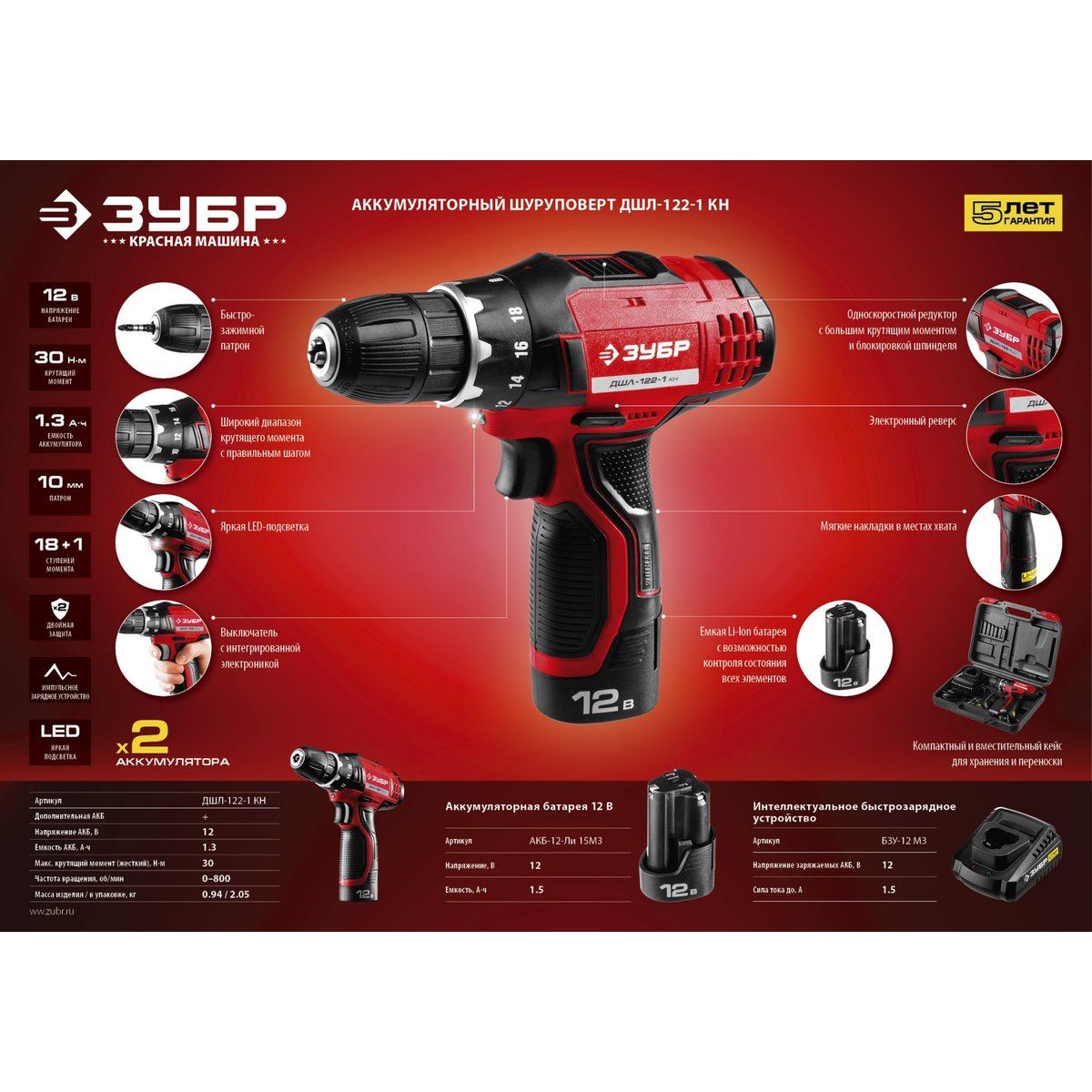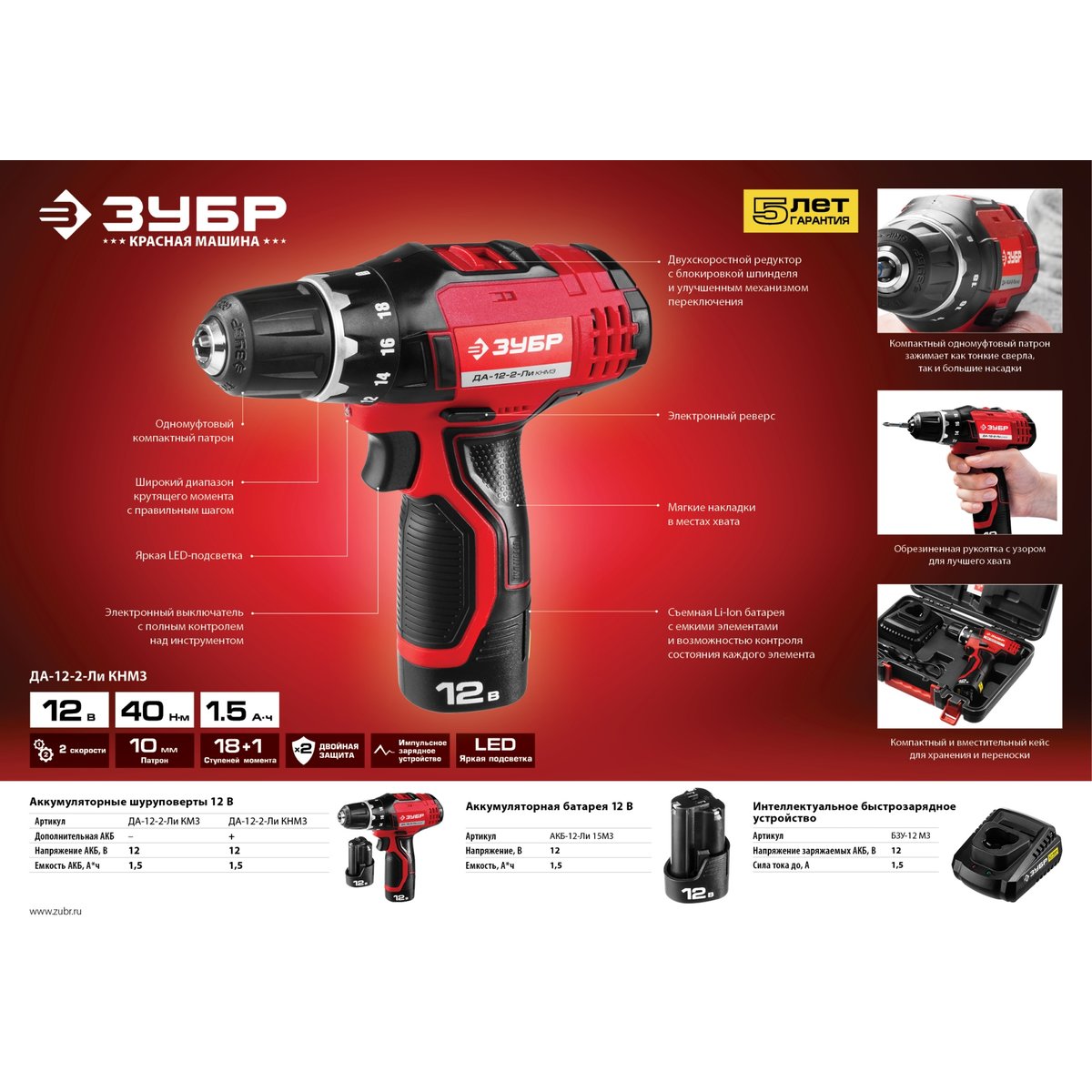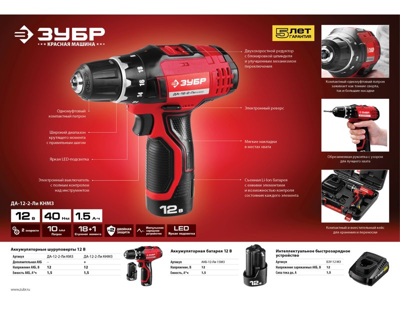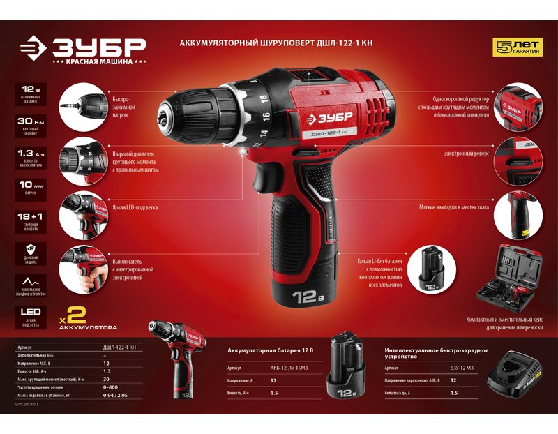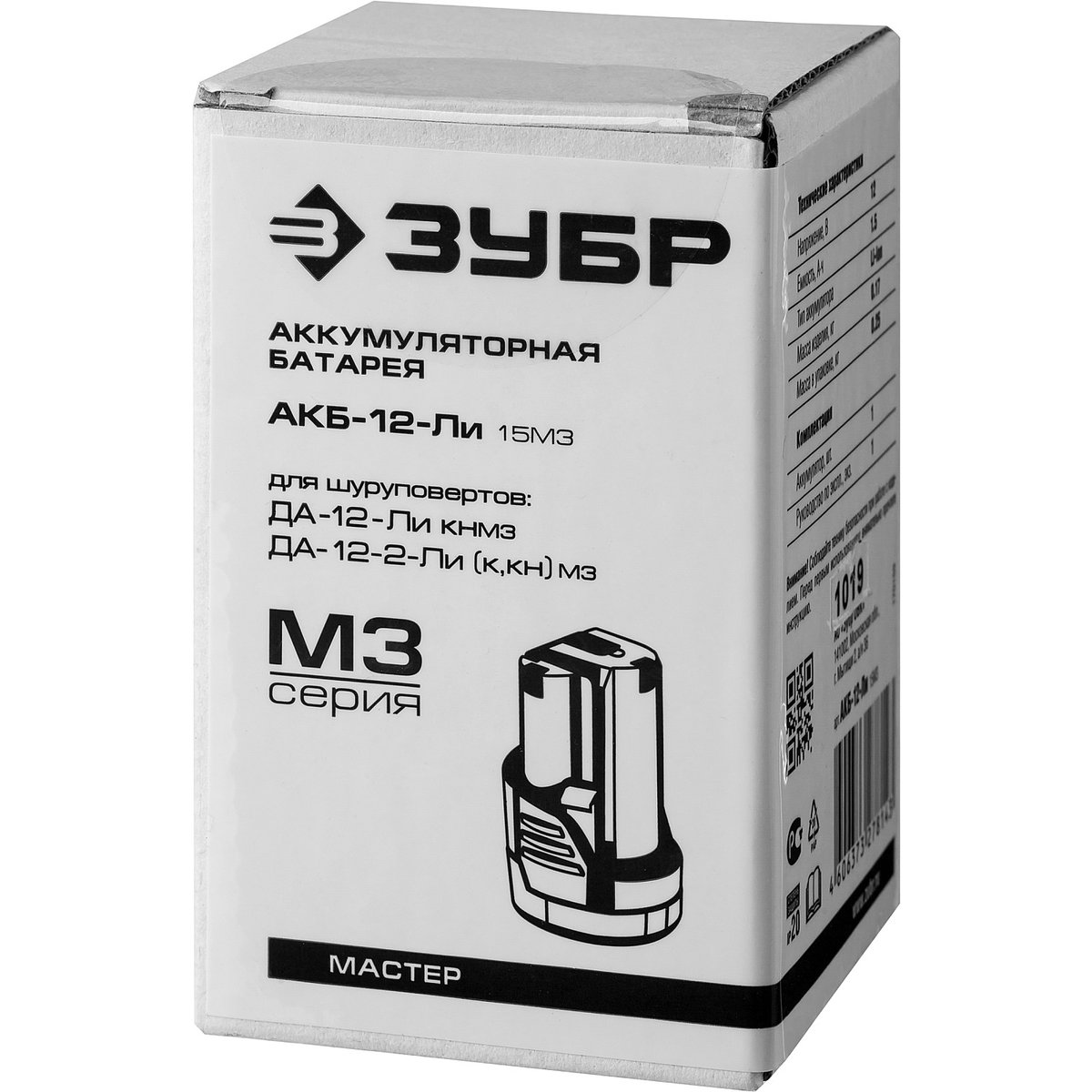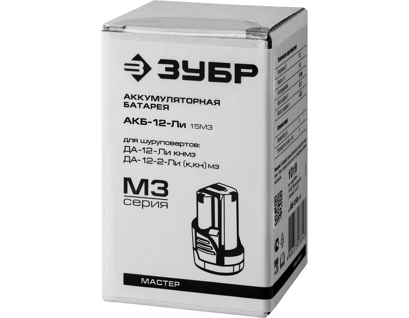 Аккумуляторная батарея ЗУБР АКБ-12-Ли 15М3, предназначена для питания шуруповерта ЗУБР ДА-12(-2)-Ли К(Н)М3. Современная Li-Ion технология элементов обеспечивает более 500 полных циклов заряда/разряда аккумулятора. Защита от перегрева увеличивает рабочий ресурс батареи, предохраняя от преждевременного выхода из строя. Возможна зарядка на БЗУ. Ударопрочный корпус из ABS-пластика продлевает срок активной эксплуатации. Зарядка может производиться в любое время. Высокая работоспособность в широком диапазоне температур, в т. ч. при отрицательных. Легко восстанавливается после длительного хранения.